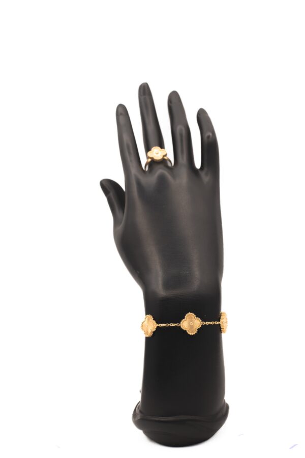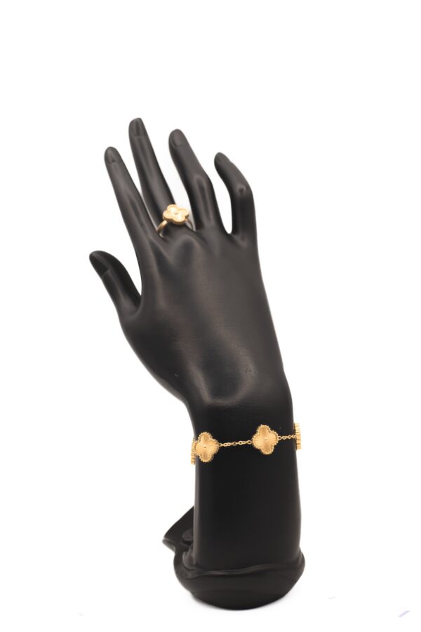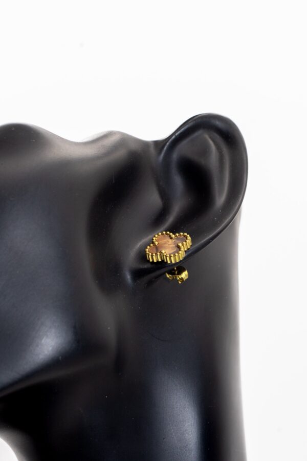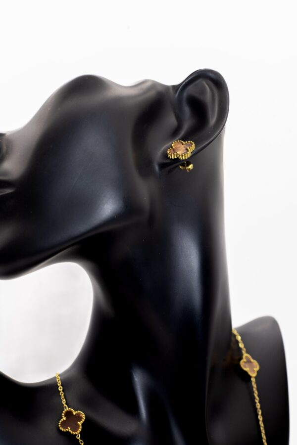 Product Description: Celebrate luck and timeless elegance with the Lucky Clover Motif Collection. This iconic design features the four-leaf clover symbol, widely cherished as a token of good fortune. Each piece is crafted in a radiant gold tone with a beaded rim that frames the center stone. Brown (Tiger Eye Style): Warm and earthy.