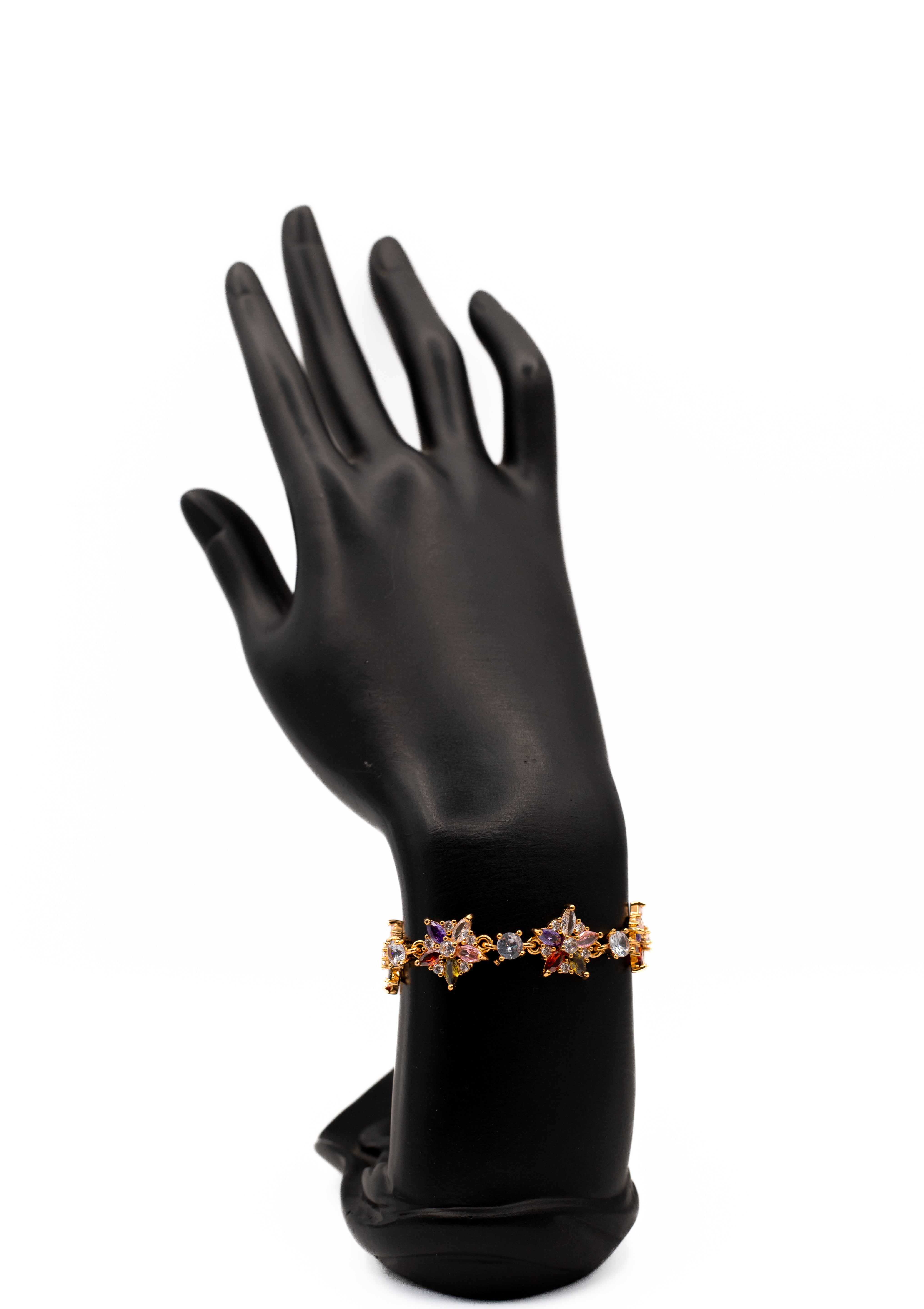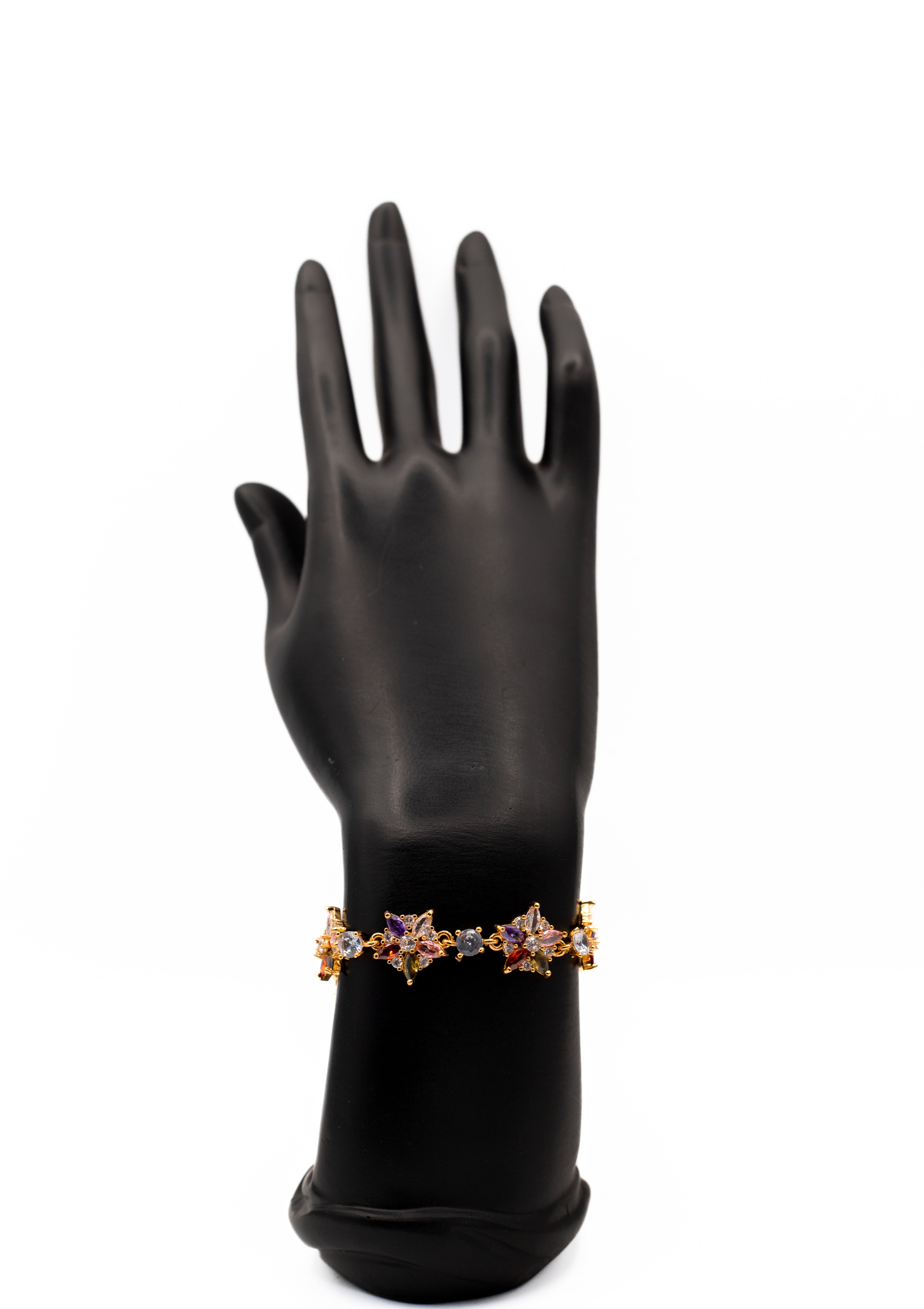 Add a pop of color with this vibrant gold-toned starburst bracelet. Featuring dazzling, multi-colored cubic zirconia stones in a playful star/flower shape. This unique piece is perfect for summer jewelry, bohemian style, or adding a fun, youthful sparkle. An excellent gift for teens or anyone who loves colorful statement jewelry.