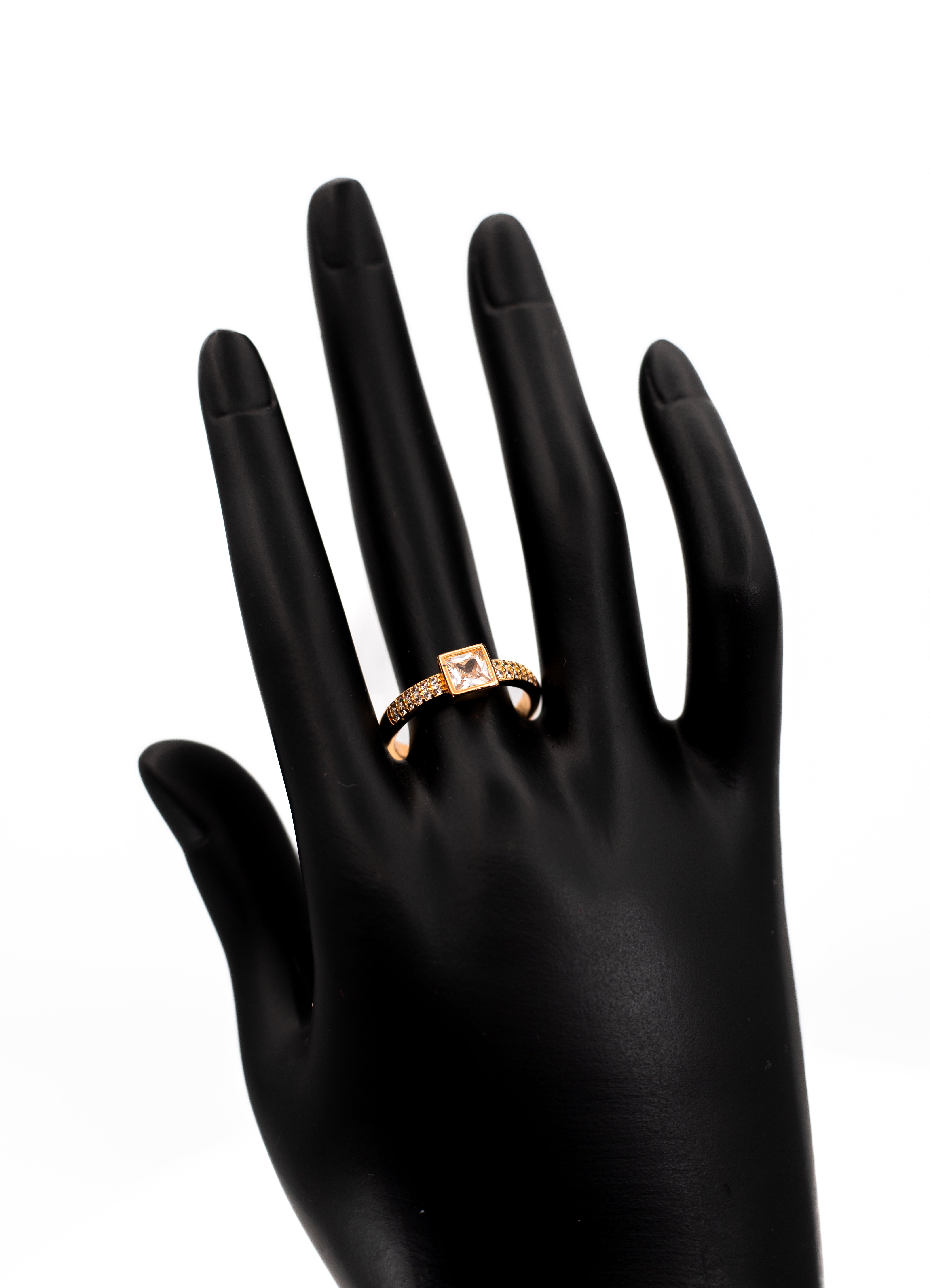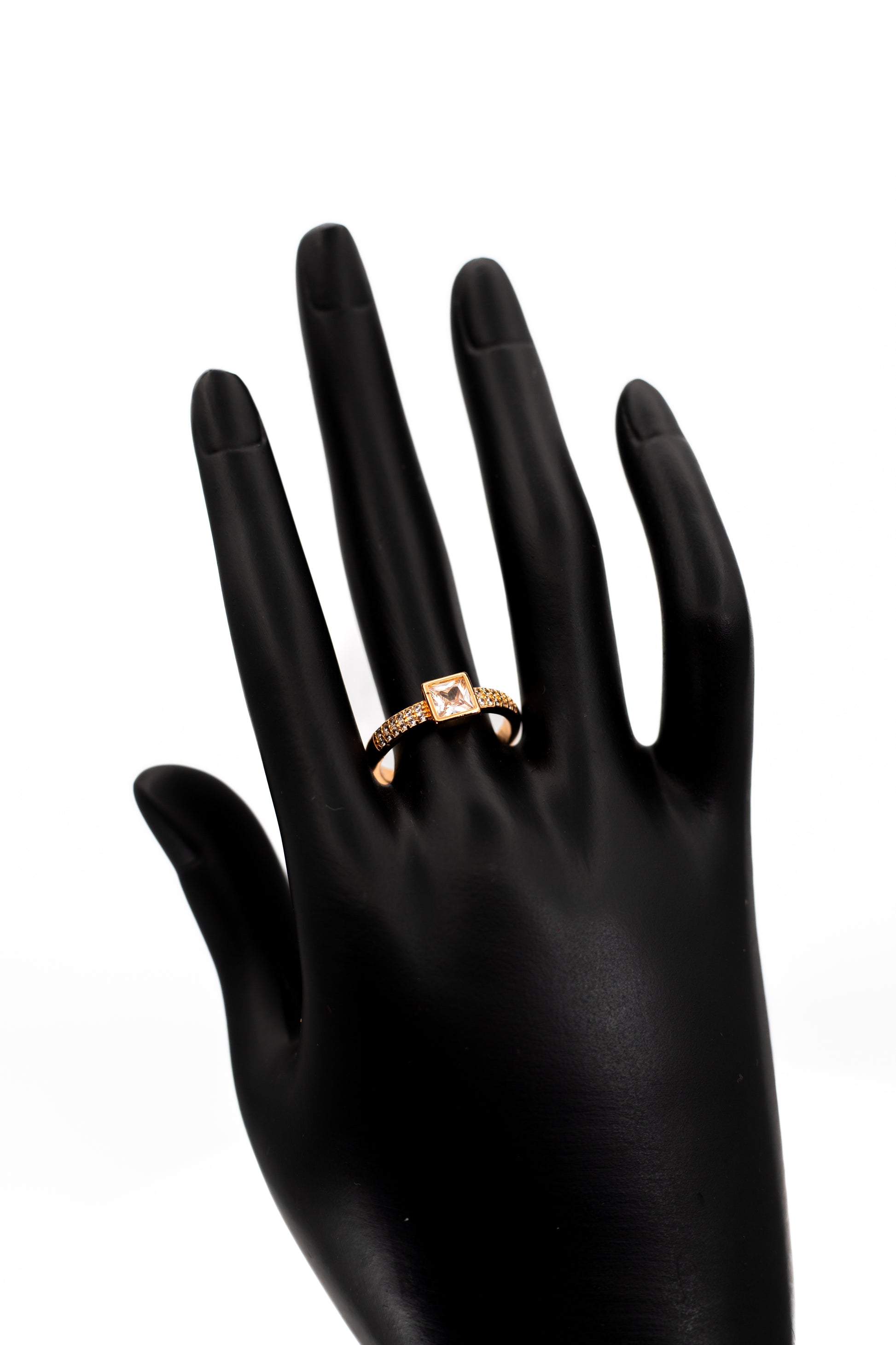 Shimmering Yellow Gold Plated ring featuring a brilliant clear/white octagon center stone. The classic halo setting and warm gold tone create a luxurious, vintage-inspired look, perfect as an affordable engagement ring or elegant cocktail piece.