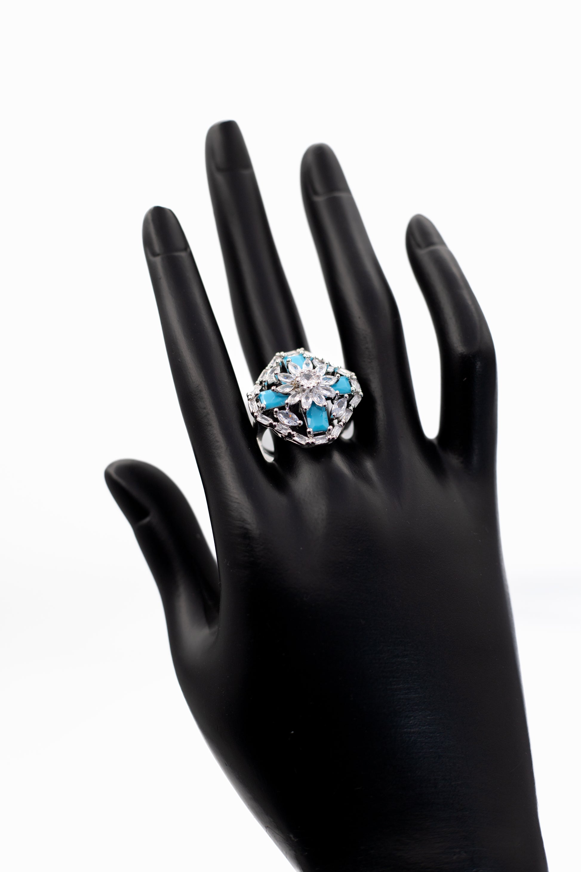 Add a touch of vibrant sophistication to your jewelry collection with our Celestial Turquoise Statement Ring. This masterfully crafted piece features a striking architectural design that centers around a blooming floral motif, making it an ideal choice for those who love bold, art-deco-inspired elegance.