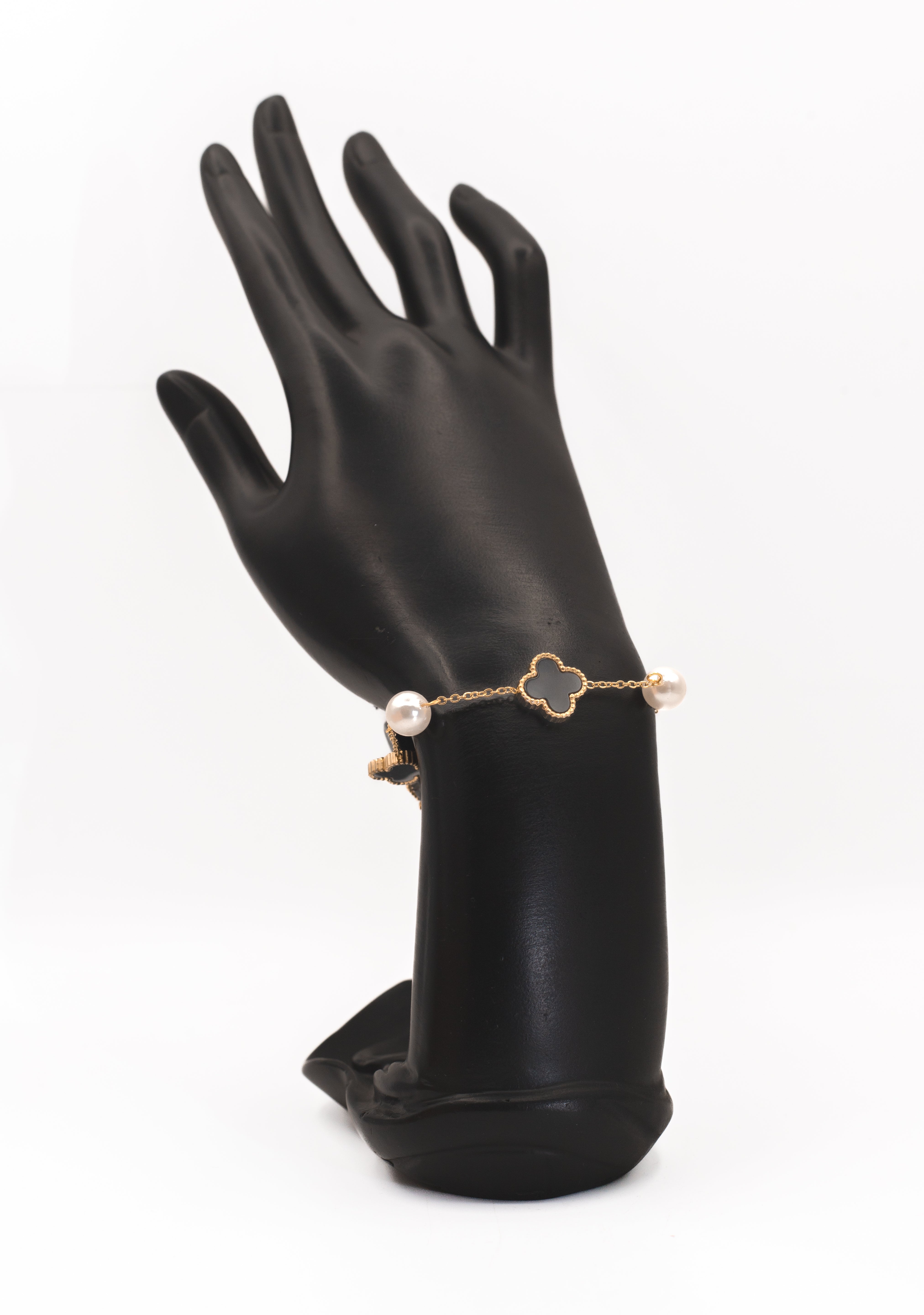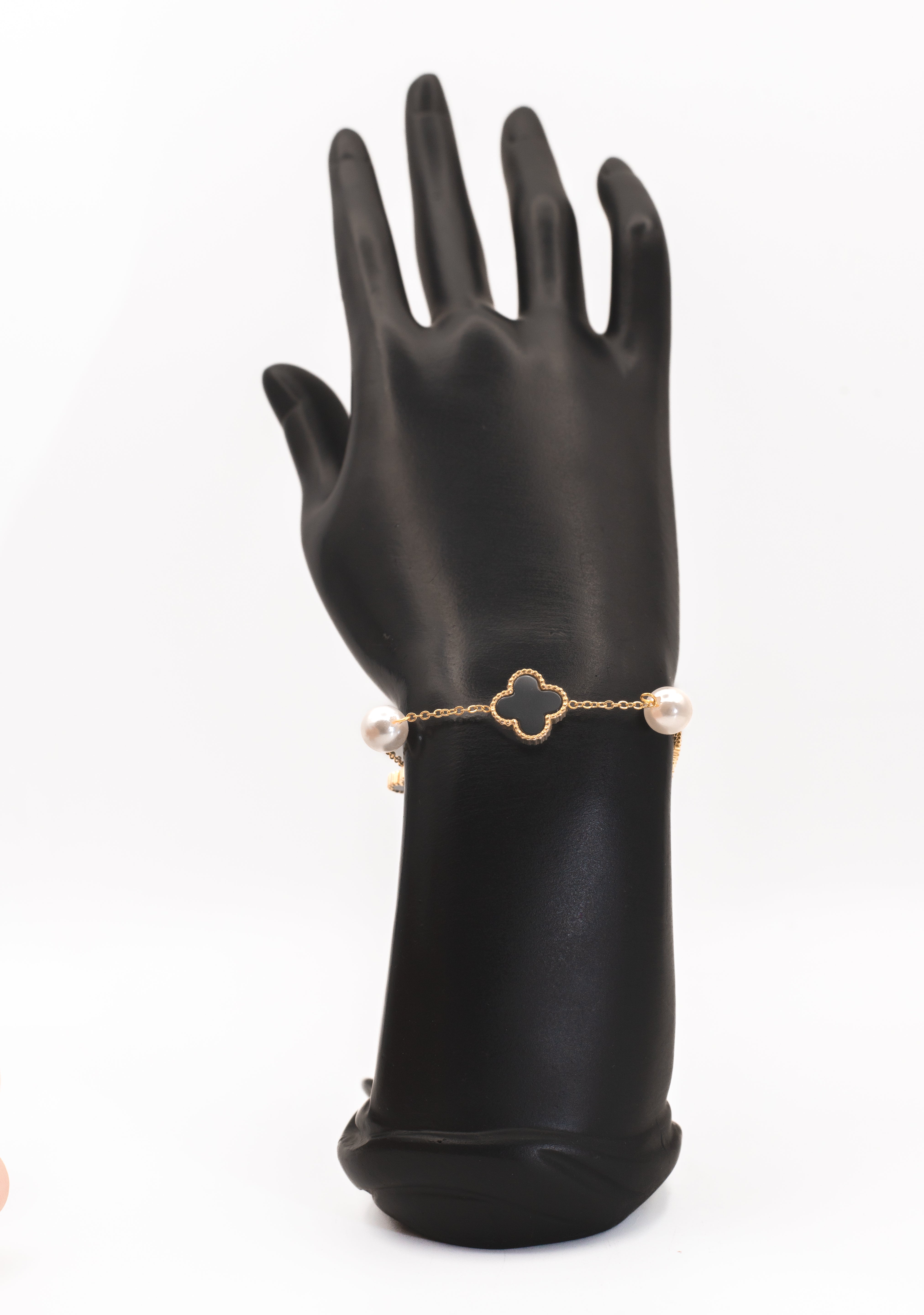 Embody subtle sophistication and iconic style with our Dainty Golden Black Clover & Pearl Charm Bracelet. This fine golden chain features a striking black enamel quatrefoil (clover) charm paired with a lustrous faux pearl. The delicate design, complete with a small dangling black clover near the clasp, is perfect for layering or wearing solo. This piece captures the blend of classic elegance and Korean-inspired charm for daily luxury.