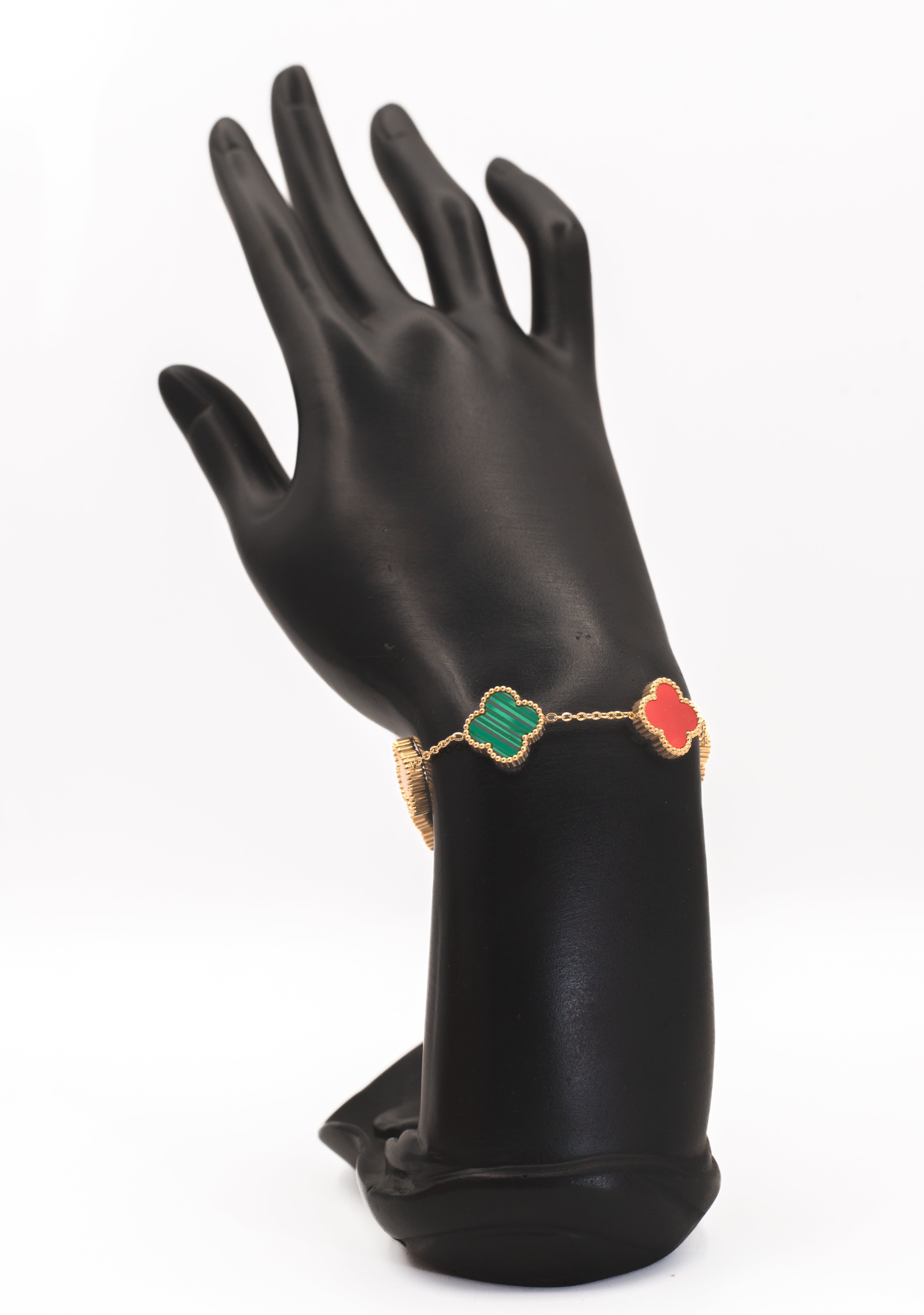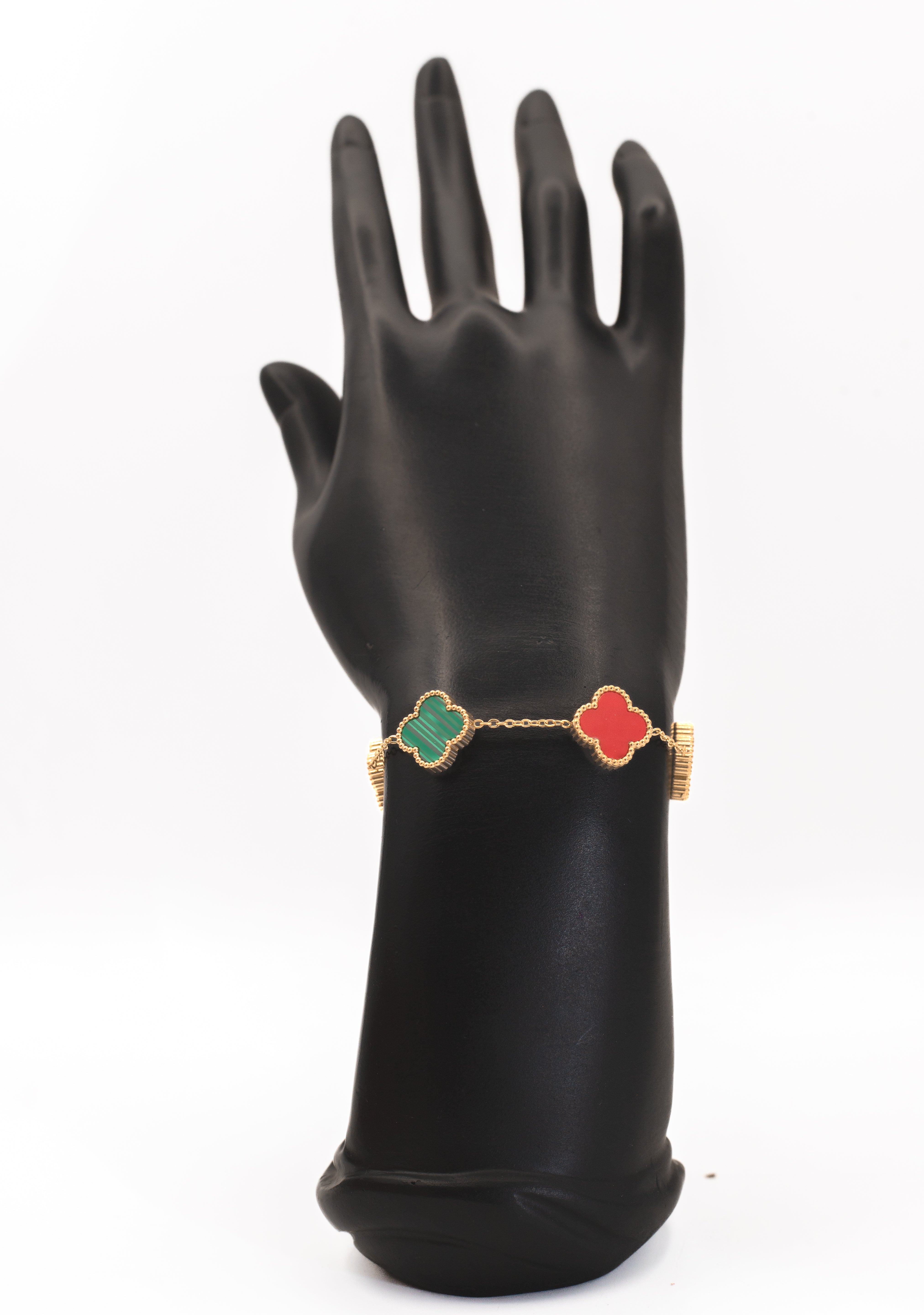 Make a vibrant statement with our Dainty Golden Red & Green Clover Bracelet. This fine golden chain features an eye-catching two-tone design with one malachite-style green clover and one carnelian-style red clover. This unique high-contrast color blend is perfect for festive occasions or adding a chic, symbolic touch to your daily wear. The elegant, dainty design embodies Korean-inspired luxury and is ideal for layering.