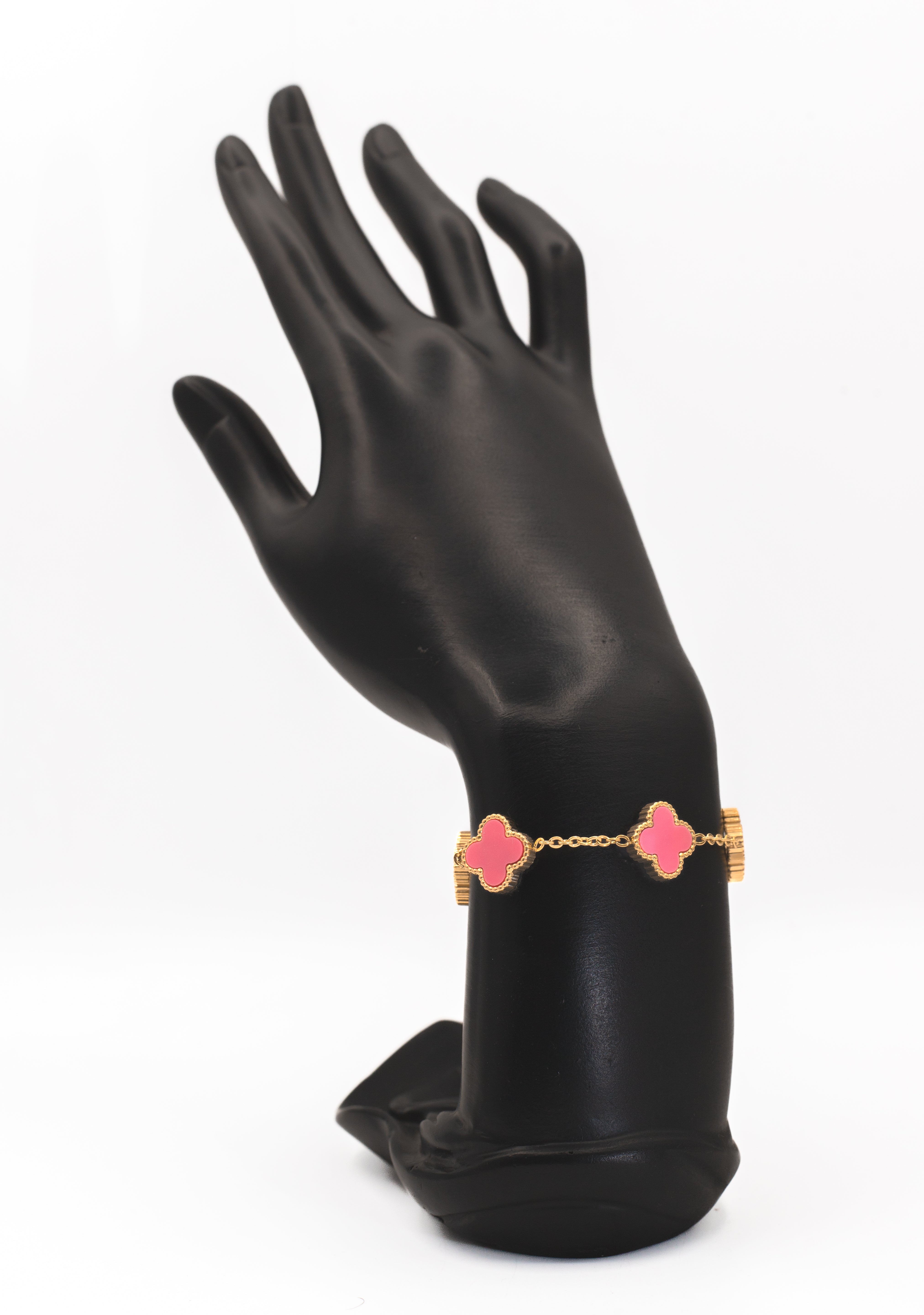 Embrace romantic style and playful luxury with our Dainty Golden Pink Enamel Clover Bracelet. This fine golden chain features two large quatrefoil (clover) charms inlaid with a vibrant vivid pink enamel. The elegant, dainty design is perfect for layering or wearing solo, capturing the subtle luxury and Korean-inspired charm for everyday sophistication.