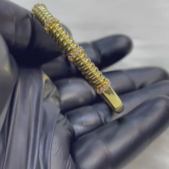 Embrace the bold sophistication of Italian-inspired design with the Gilded Ribbed Tubogas Bangle. This piece features the iconic "tubogas" or gaspipe-style ribbed band, offering a unique tactile texture that exudes modern luxury. The rich gold-tone finish is beautifully broken by brilliant stone-set accents, making it a perfect fusion of industrial edge and feminine sparkle.