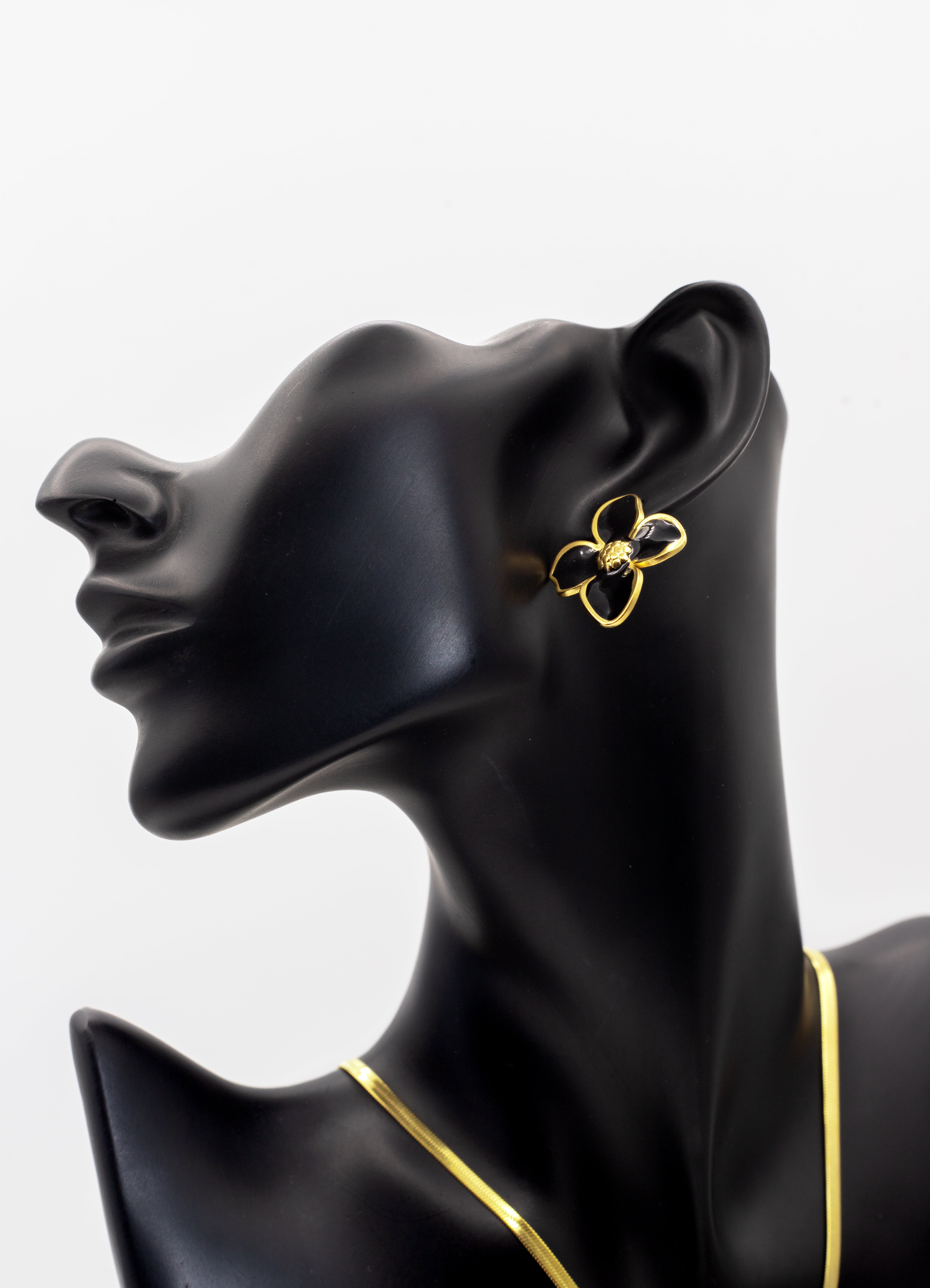 Define unique style and sophisticated glamour with our Luxury Golden Black Enamel Floral Stud Tops. These prominent earrings feature a large, four-petal flower design bordered in polished gold. The petals are inlaid with a luminous glossy black enamel, creating a striking high-contrast statement. Perfect for making a bold, chic impression, these studs embody Korean-inspired charm and luxurious style.