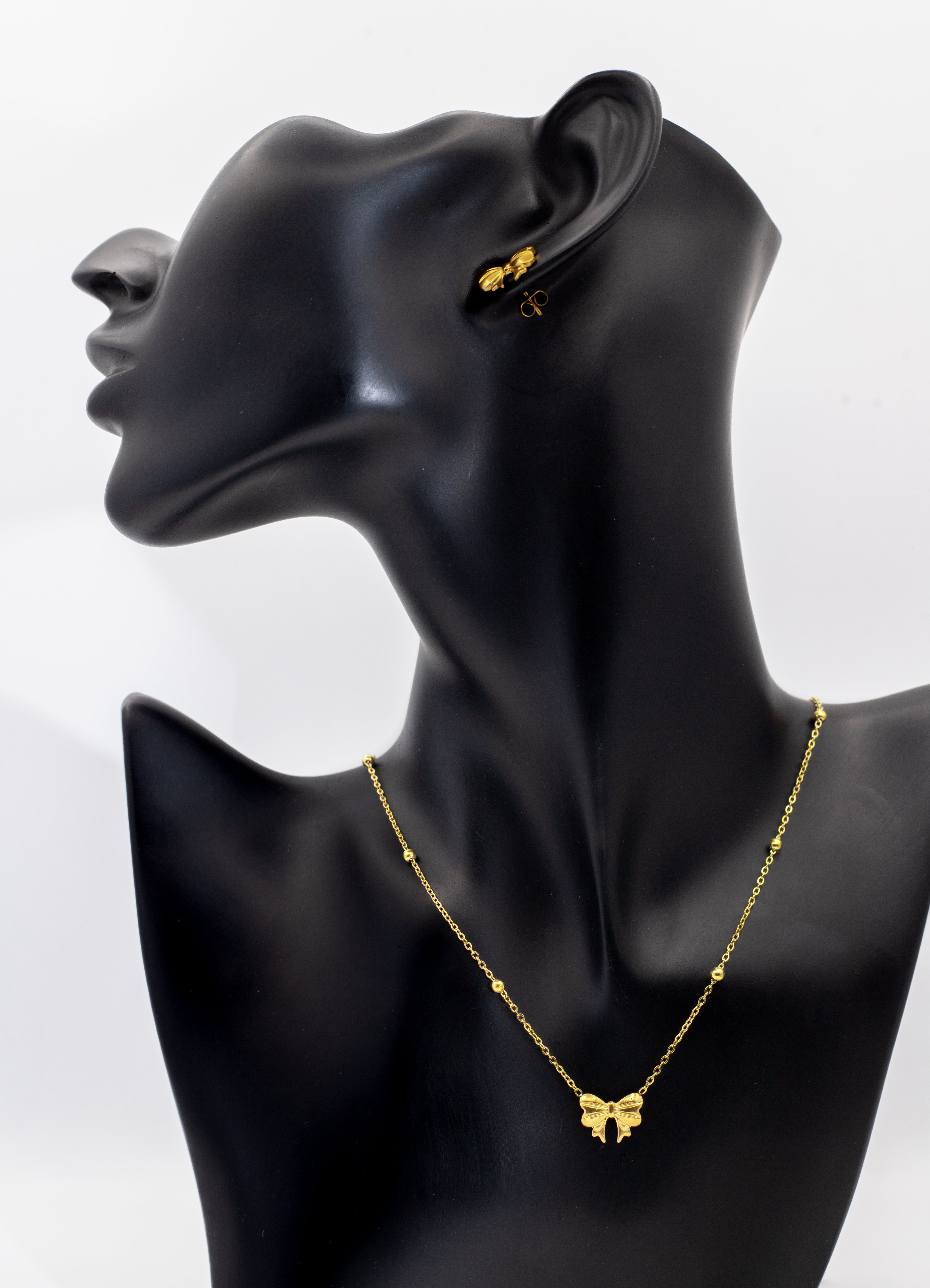 Embody subtle sweetness and dainty luxury with our Dainty Golden Bow Charm Necklace & Stud Tops Set. The necklace features a delicate golden chain with small beads and a charming polished golden bow pendant. The set includes matching tiny bow stud earrings. This minimalist set captures a feminine, Korean-inspired style that is perfect for everyday elegance and layering.