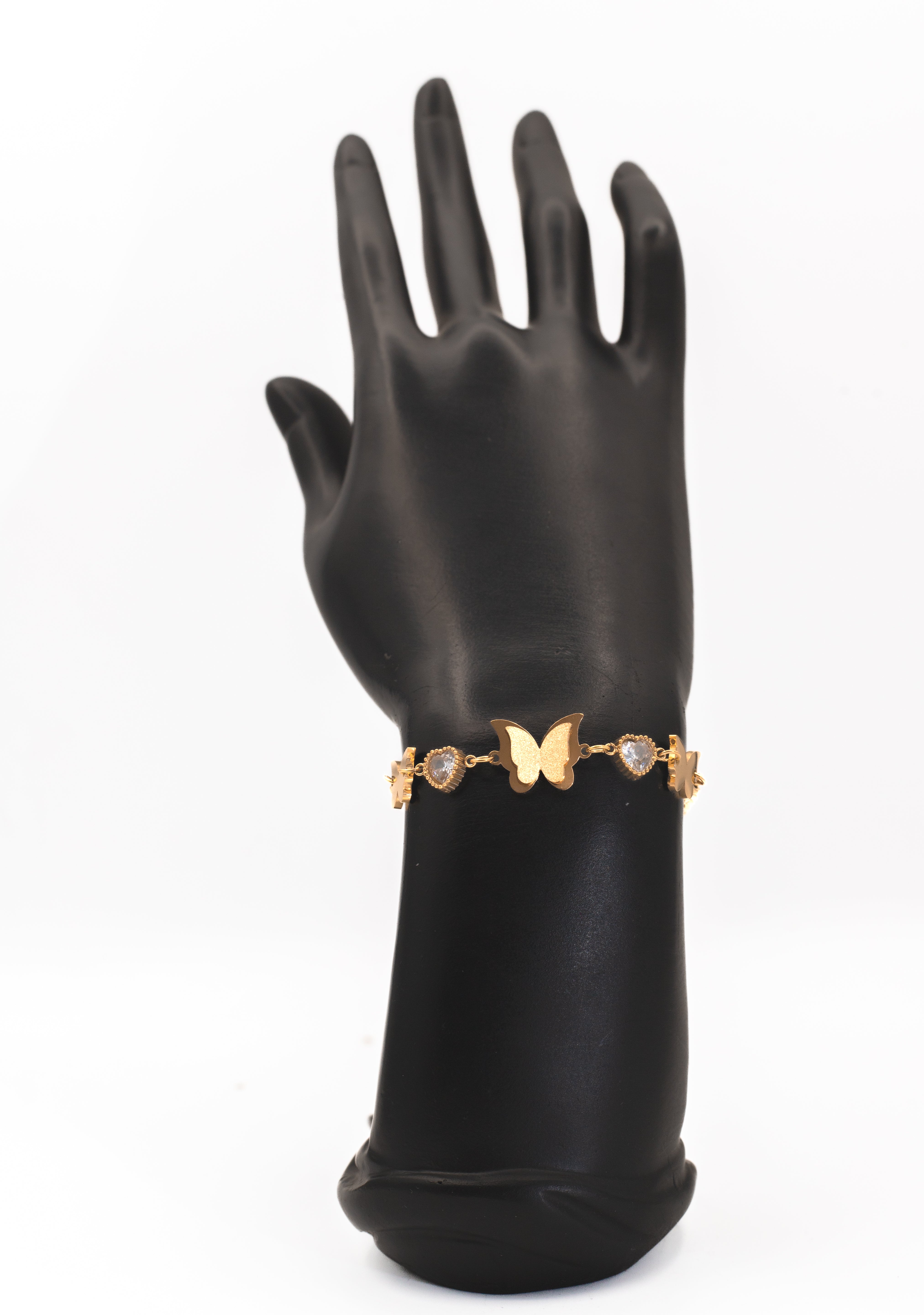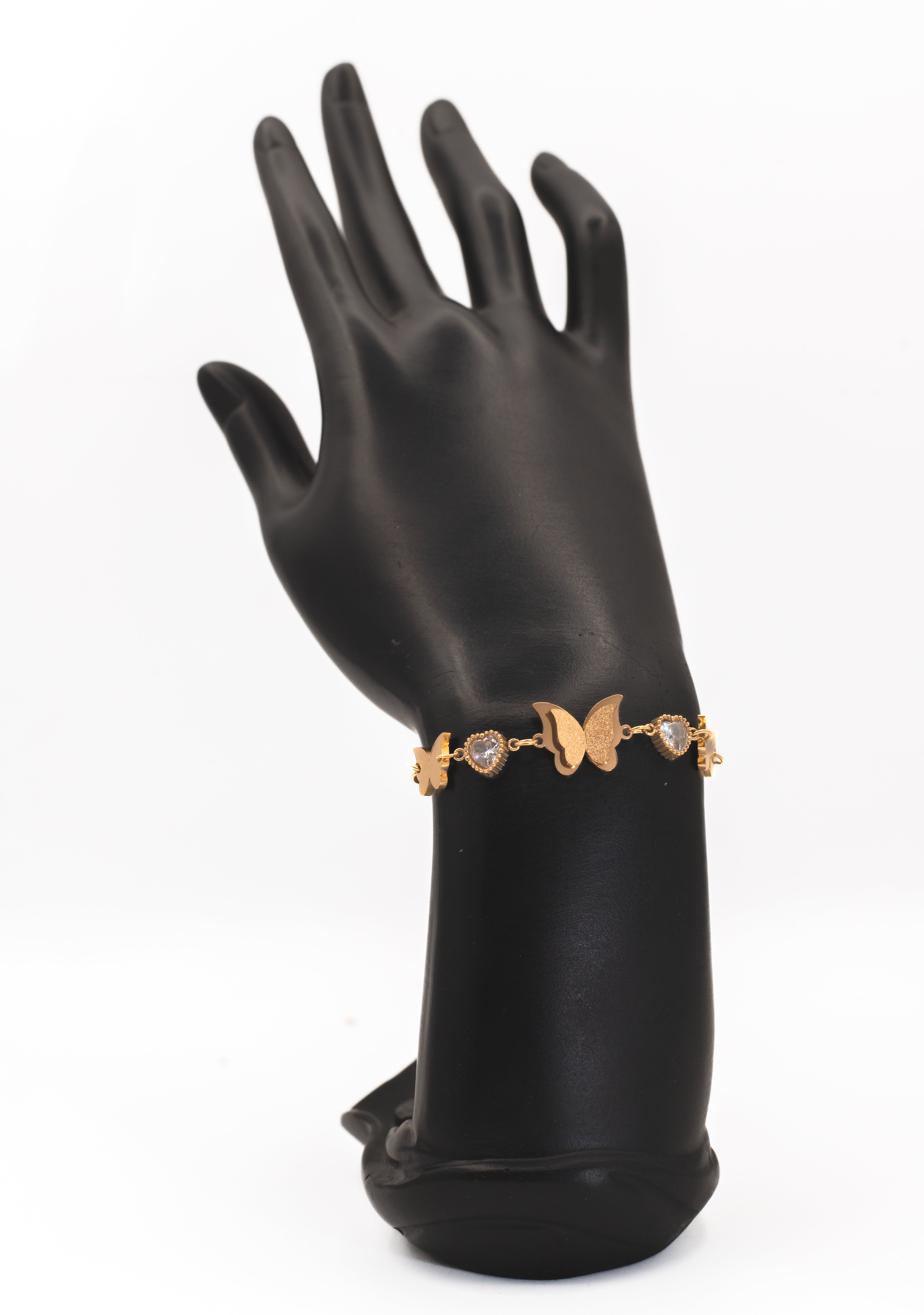 Embody romantic charm and subtle luxury with our Dainty Golden Butterfly & Crystal Heart Charm Bracelet. This fine golden chain features alternating delicate charms: polished golden butterflies, elegant plain butterfly outlines, and sparkling pave crystal heart charms. This beautiful bracelet is perfect for layering or wearing solo, capturing a whimsical, Korean-inspired charm aesthetic for daily elegance.