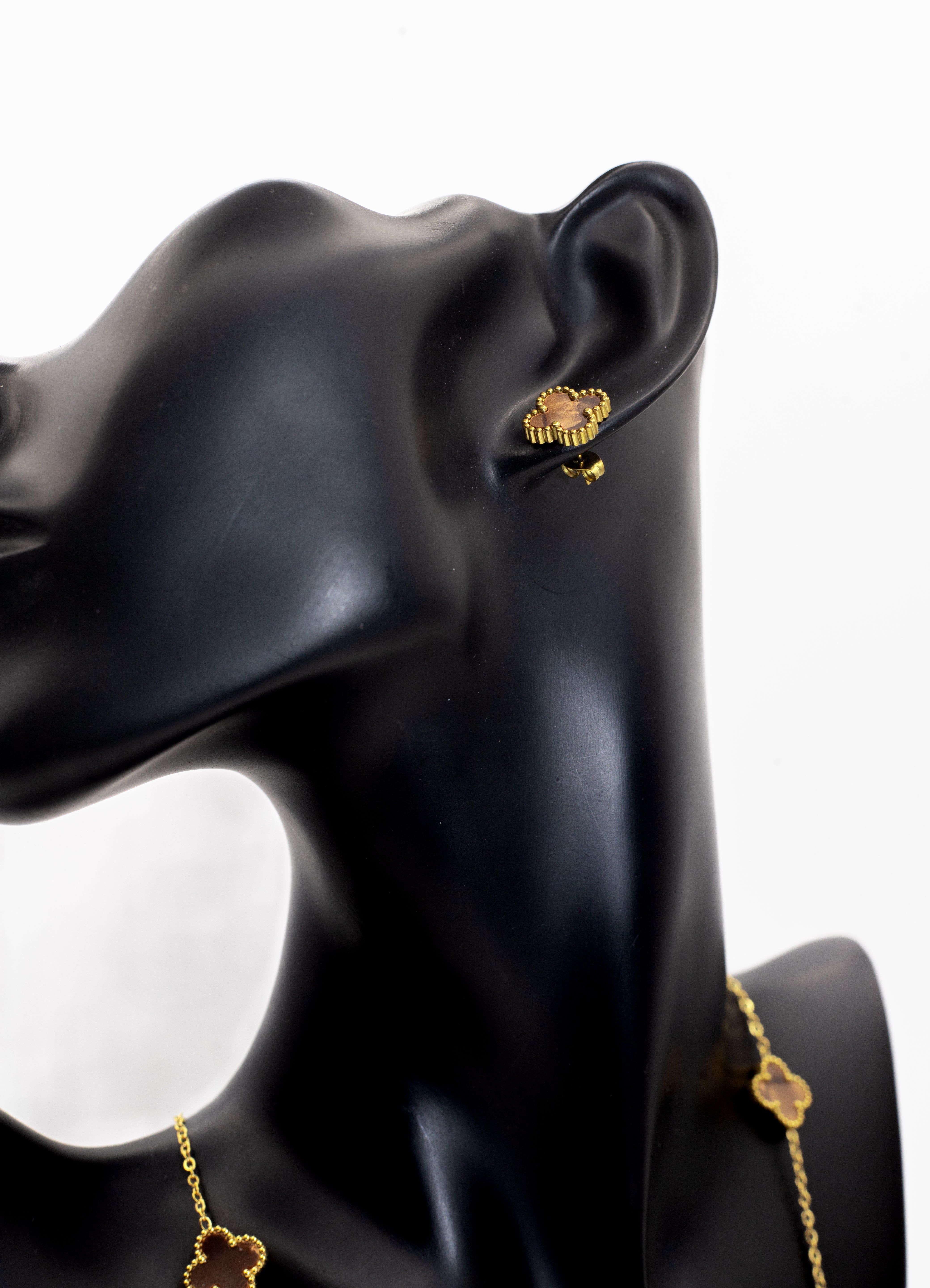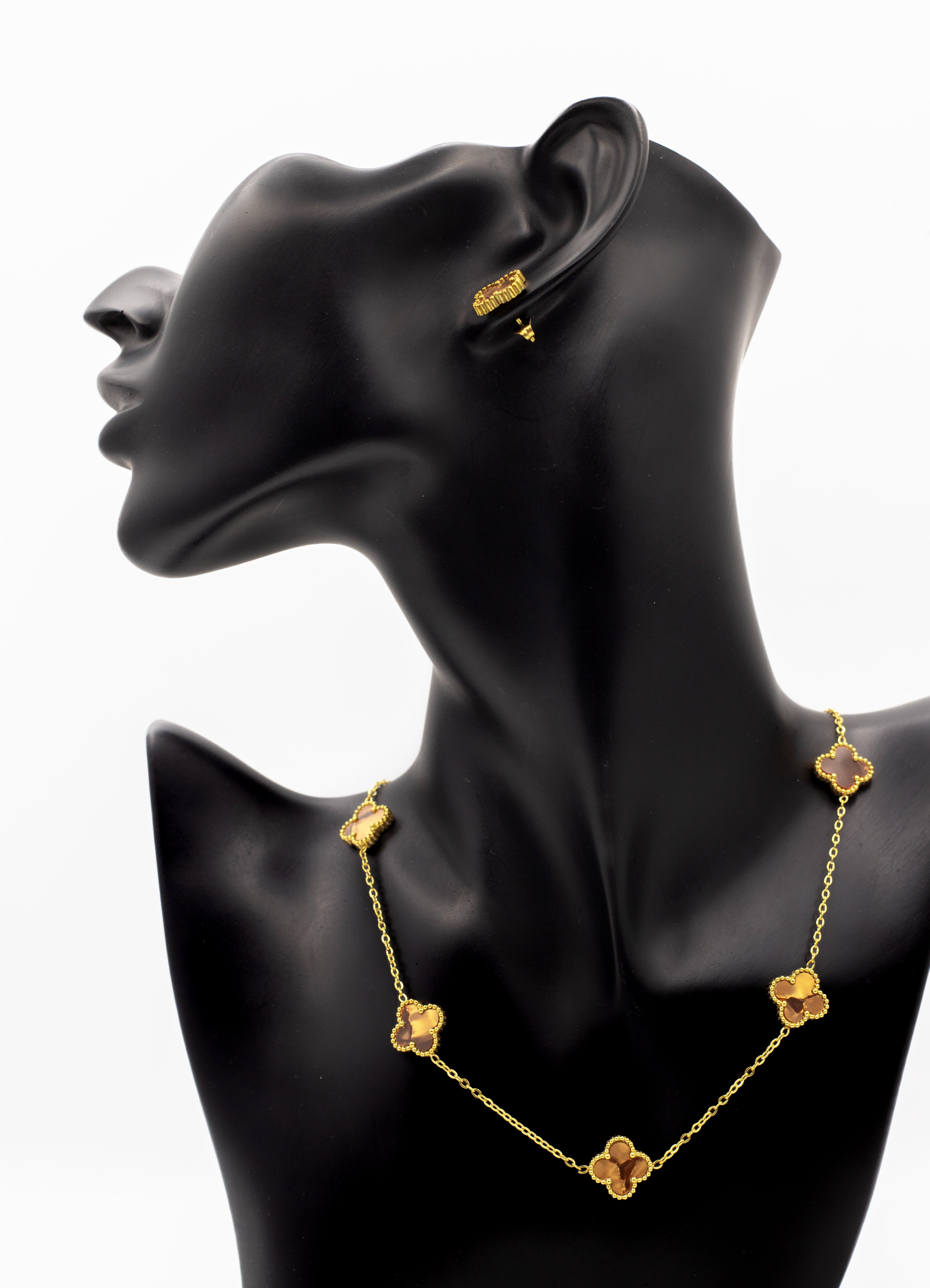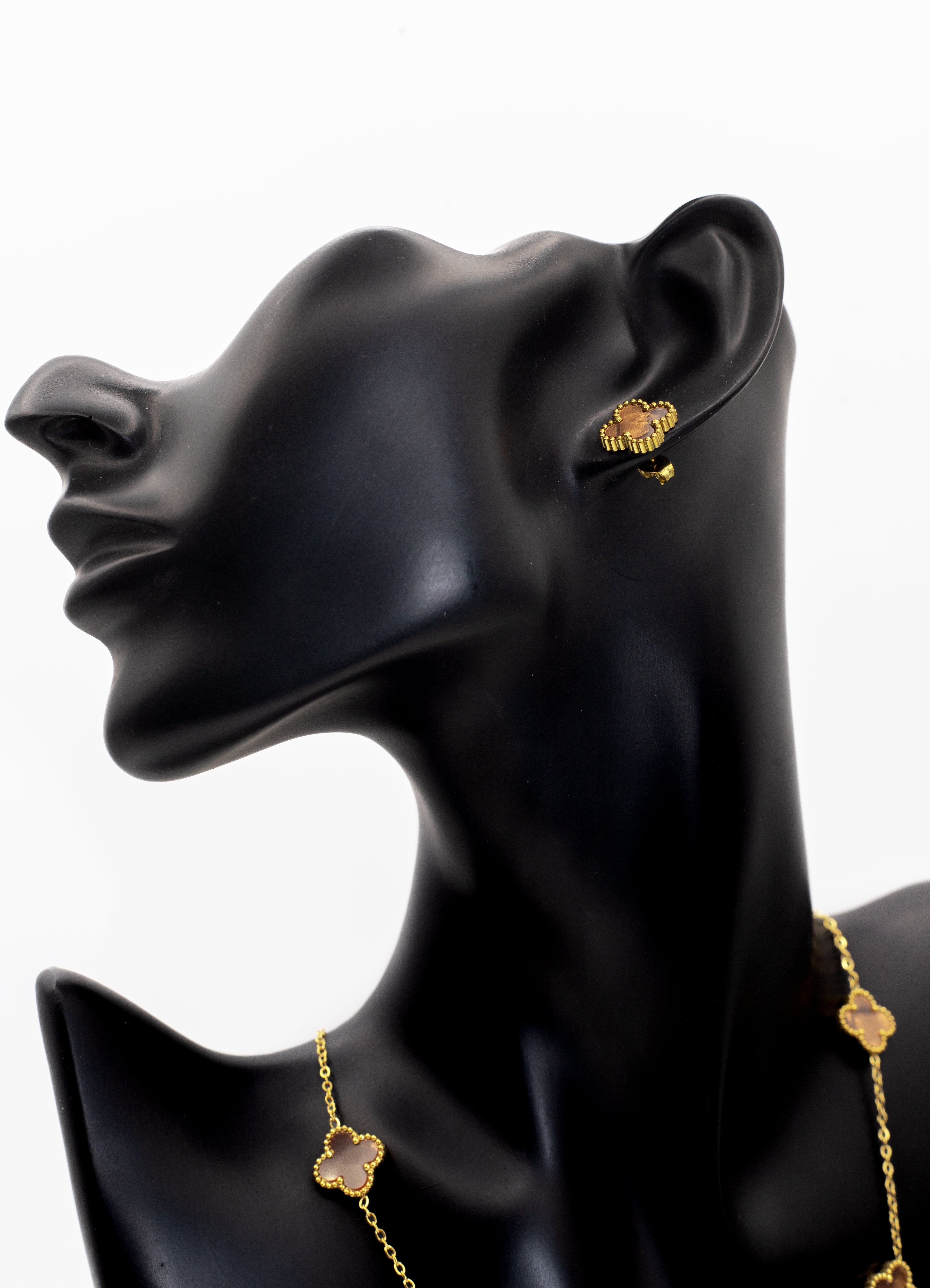 Product Description: Celebrate luck and timeless elegance with the Lucky Clover Motif Collection. This iconic design features the four-leaf clover symbol, widely cherished as a token of good fortune. Each piece is crafted in a radiant gold tone with a beaded rim that frames the center stone. Brown (Tiger Eye Style): Warm and earthy.