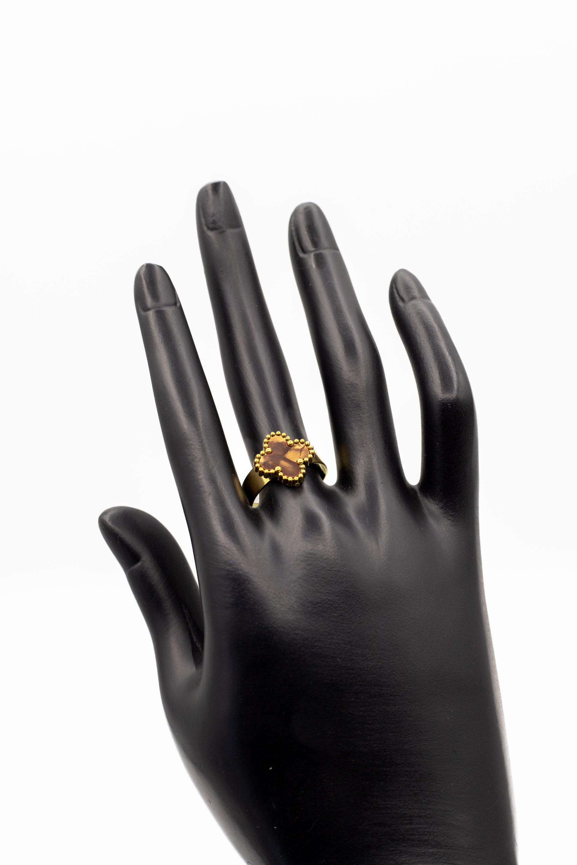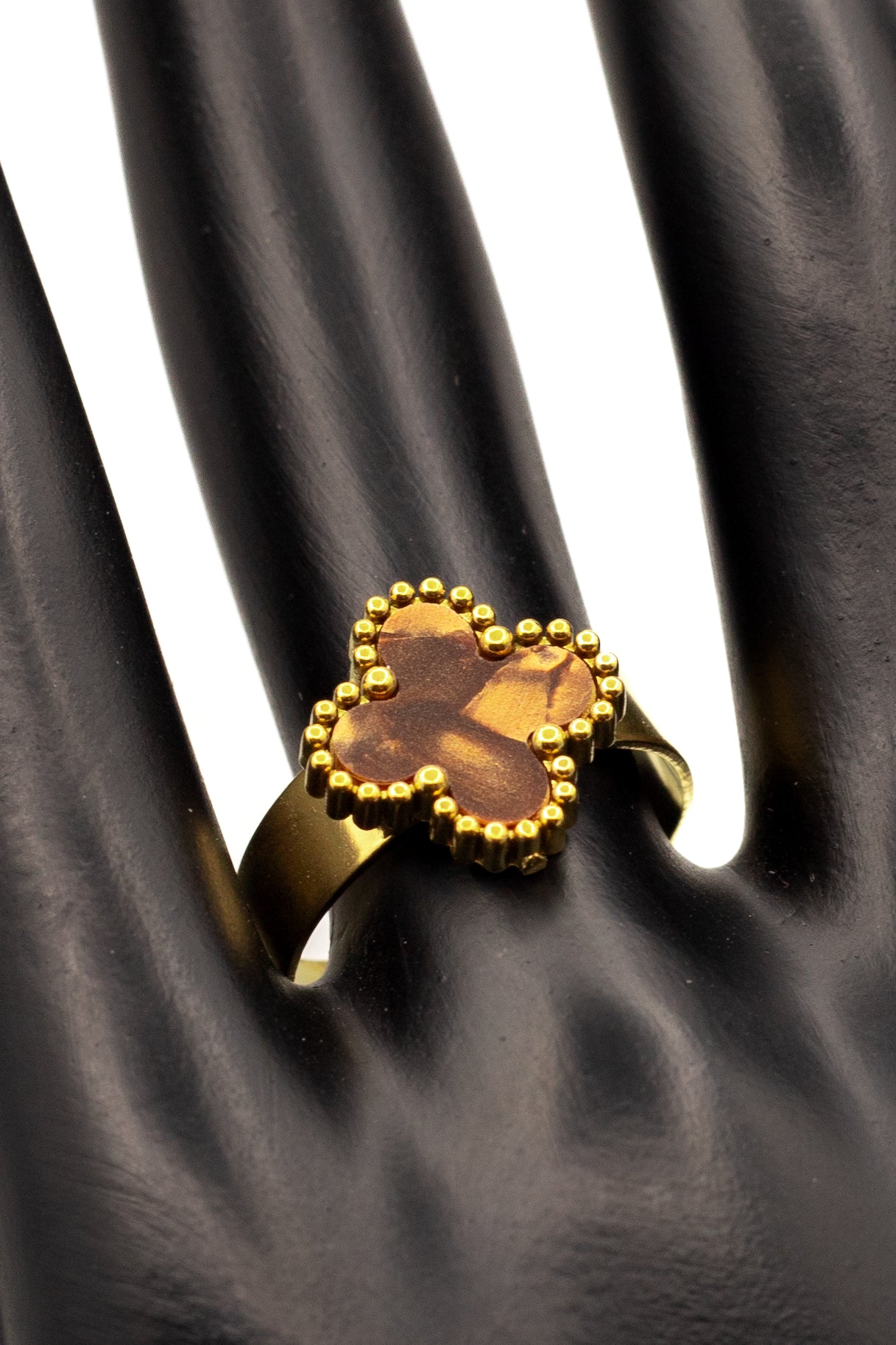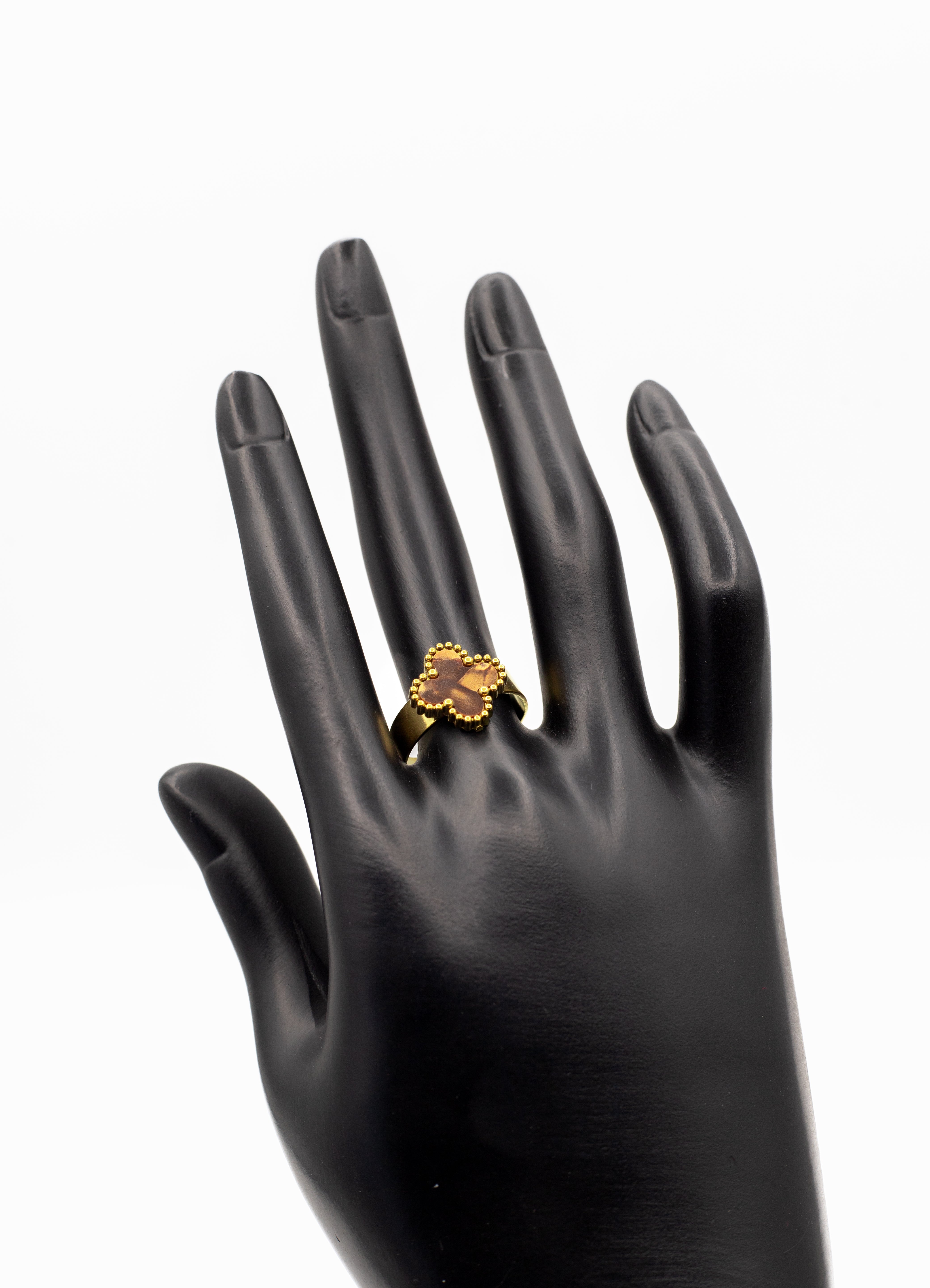 Product Description: Celebrate luck and timeless elegance with the Lucky Clover Motif Collection. This iconic design features the four-leaf clover symbol, widely cherished as a token of good fortune. Each piece is crafted in a radiant gold tone with a beaded rim that frames the center stone. Brown (Tiger Eye Style): Warm and earthy.