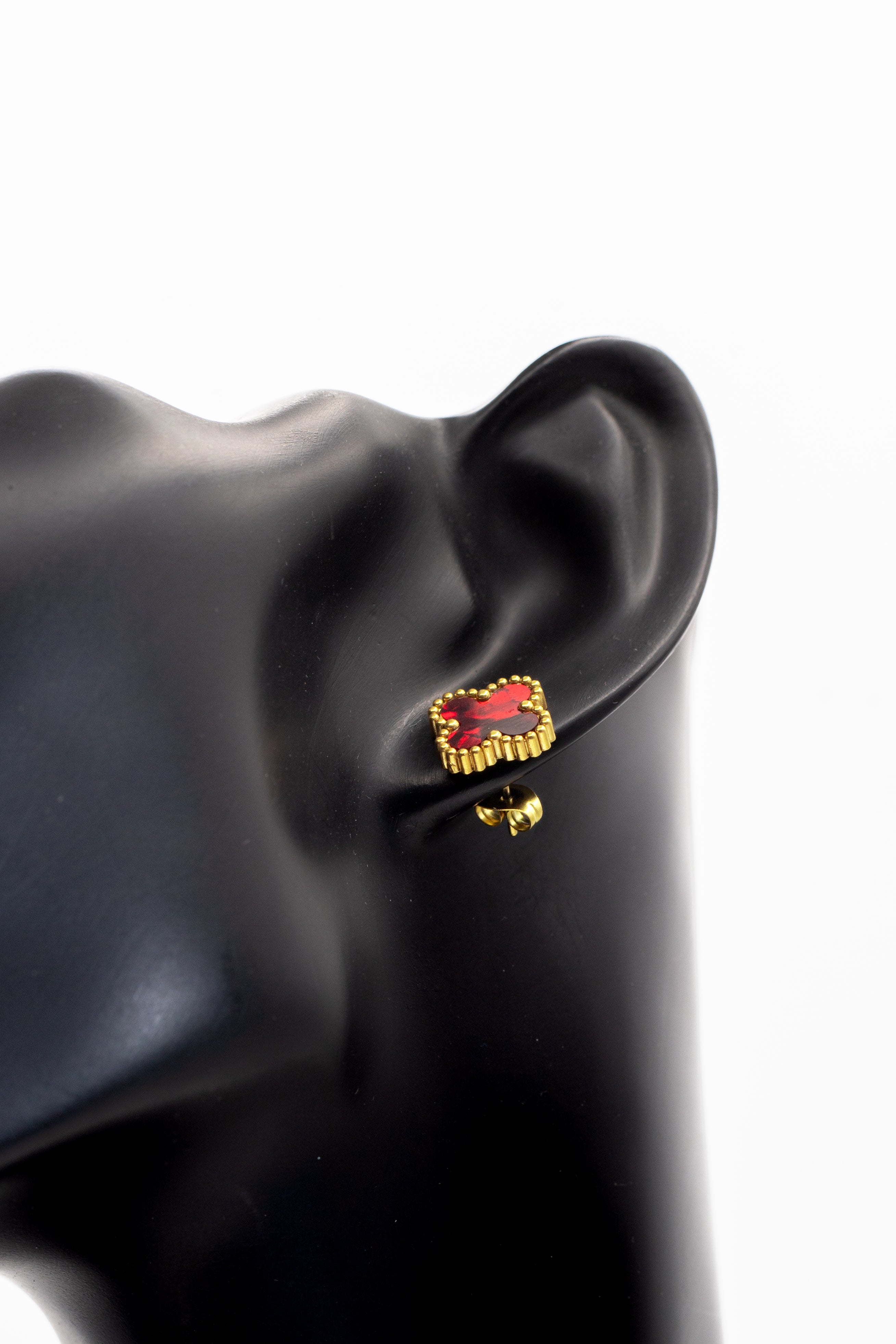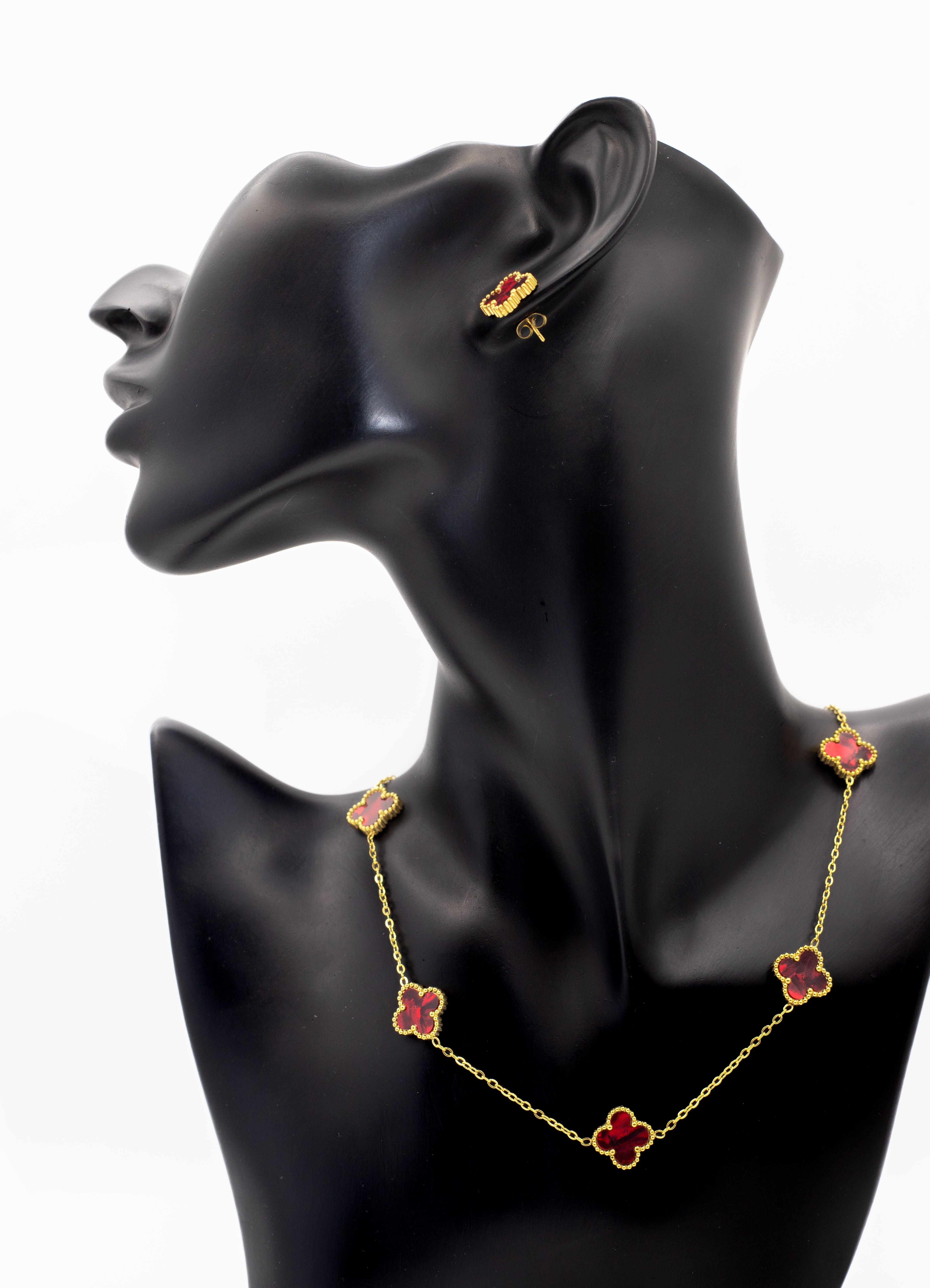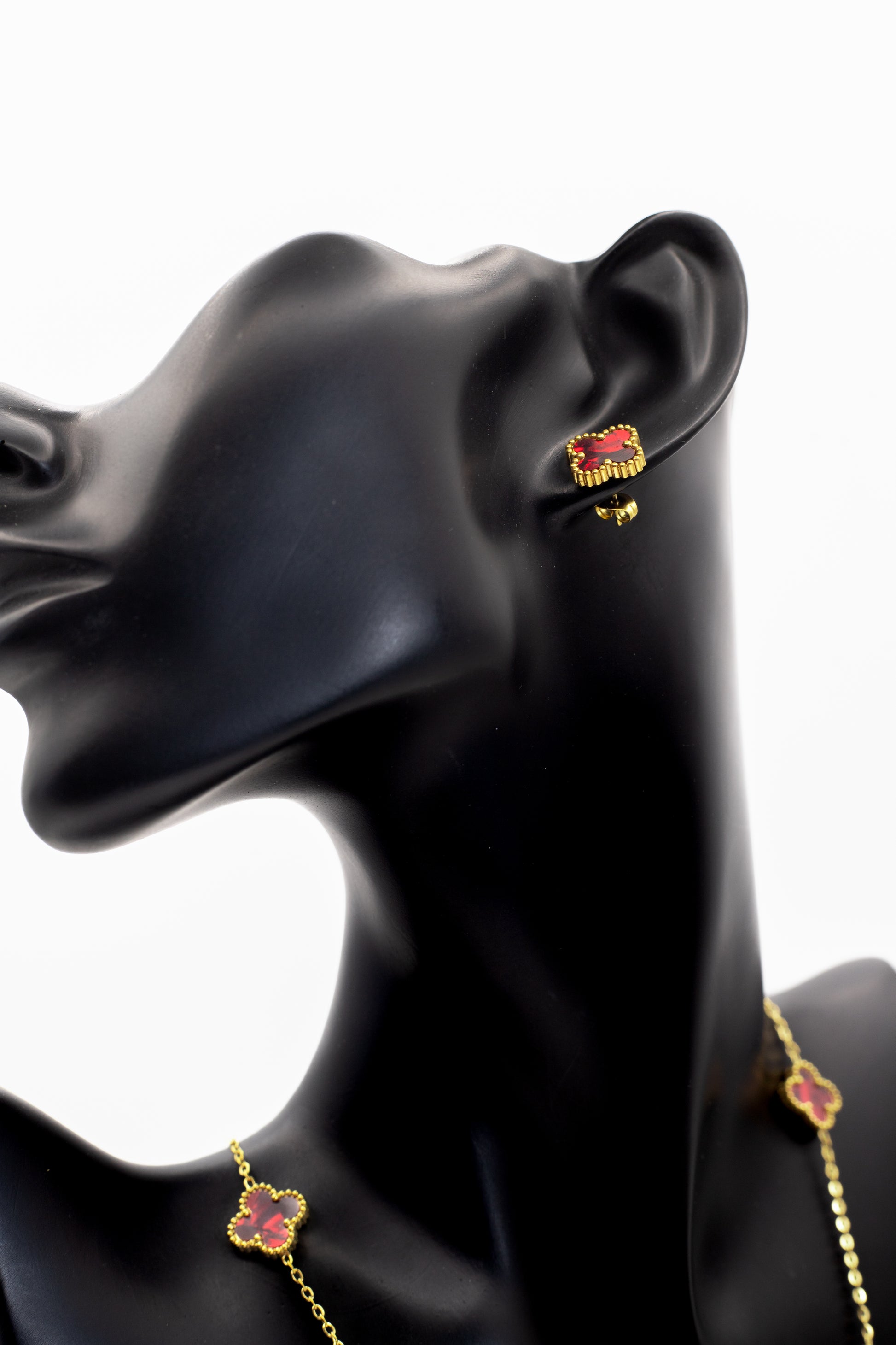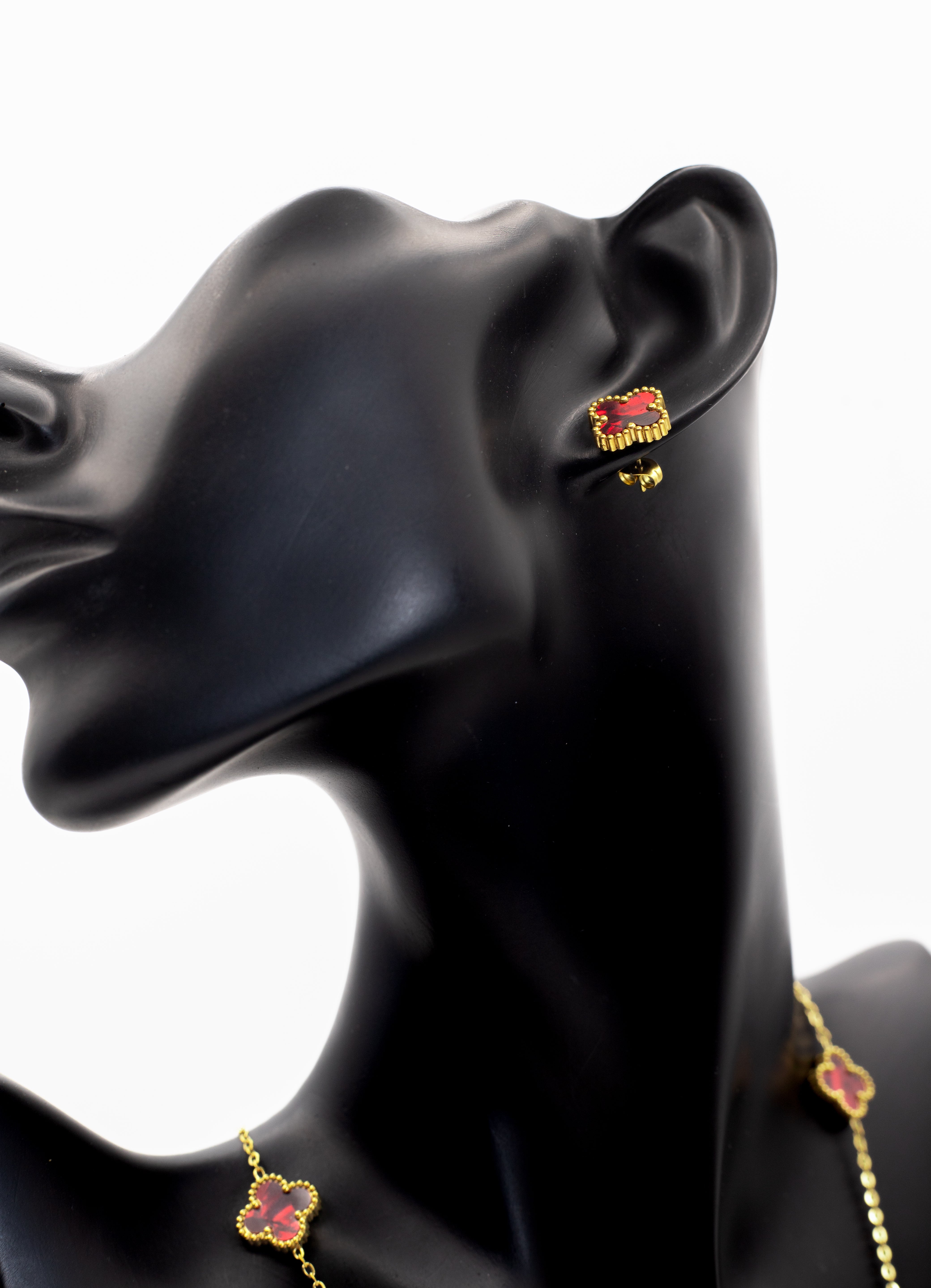 Product Description: Celebrate luck and timeless elegance with the Lucky Clover Motif Collection. This iconic design features the four-leaf clover symbol, widely cherished as a token of good fortune. Each piece is crafted in a radiant gold tone with a delicate beaded rim that frames the vibrant center stone. Choose from a stunning array of finishes to match your style .Red (Carnelian Style): Bold and romantic.