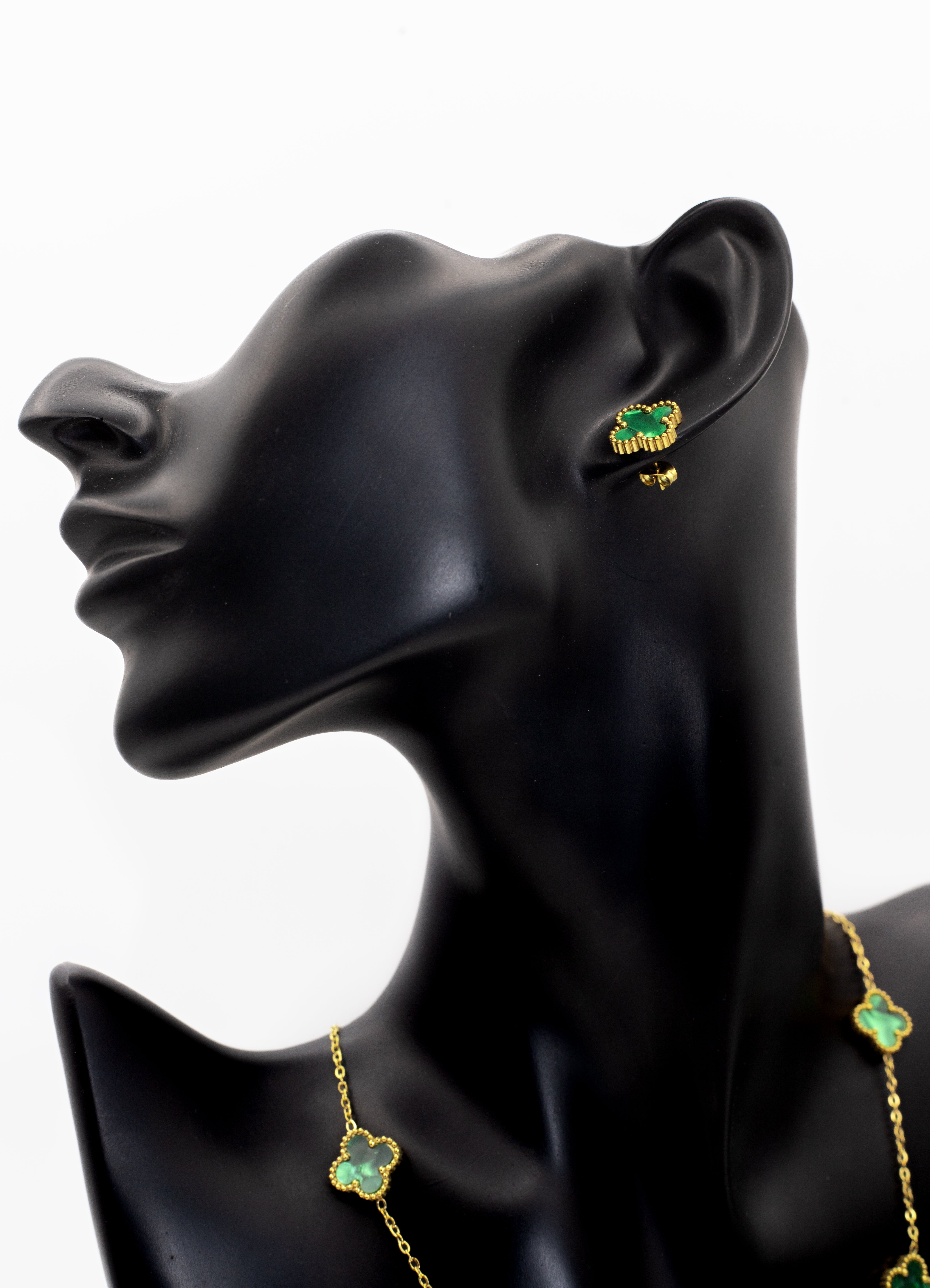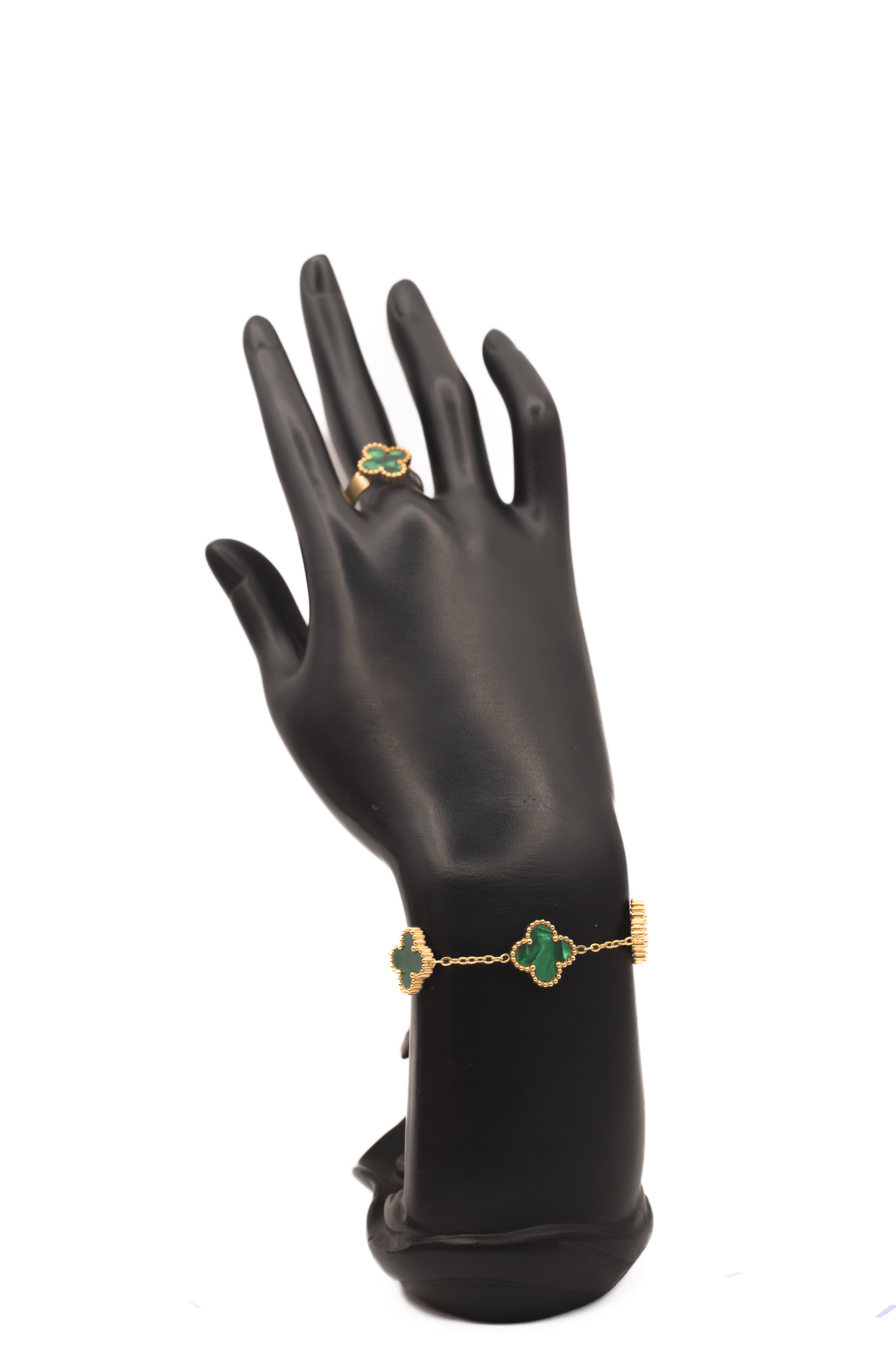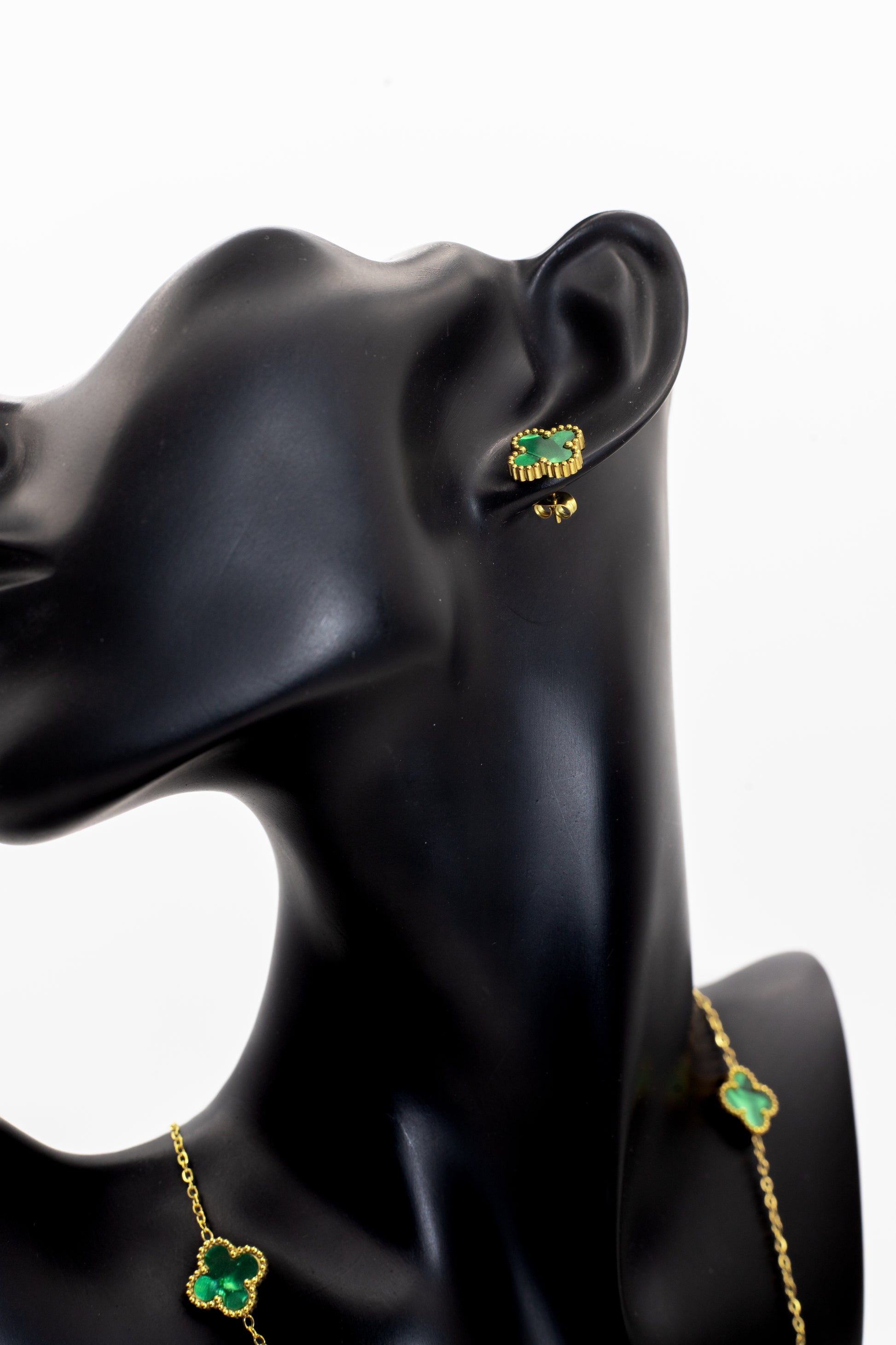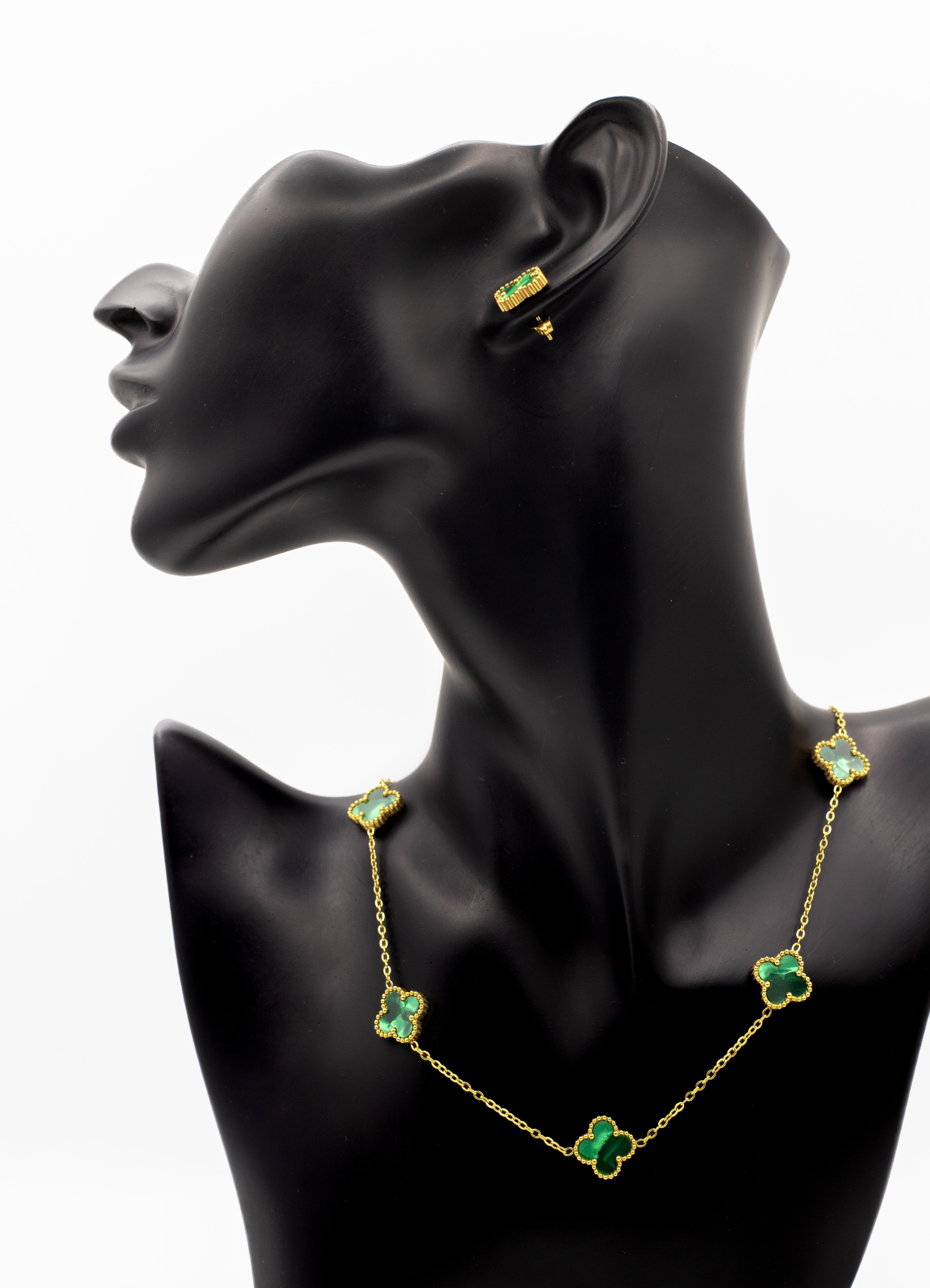 Product Description: Celebrate luck and luxury with the Lucky Clover Motif Collection. This extensive range features the timeless four-leaf clover symbol, crafted to perfection in gleaming gold tones. Choose from vibrant Green Malachite .Each piece is rimmed with delicate golden beading, adding a vintage-inspired texture to the modern design. Whether you choose the delicate station necklace, the matching bracelet, the statement ring, or the stud earrings, this collection offers endless possibilities for building a coordinated, sophisticated look.
