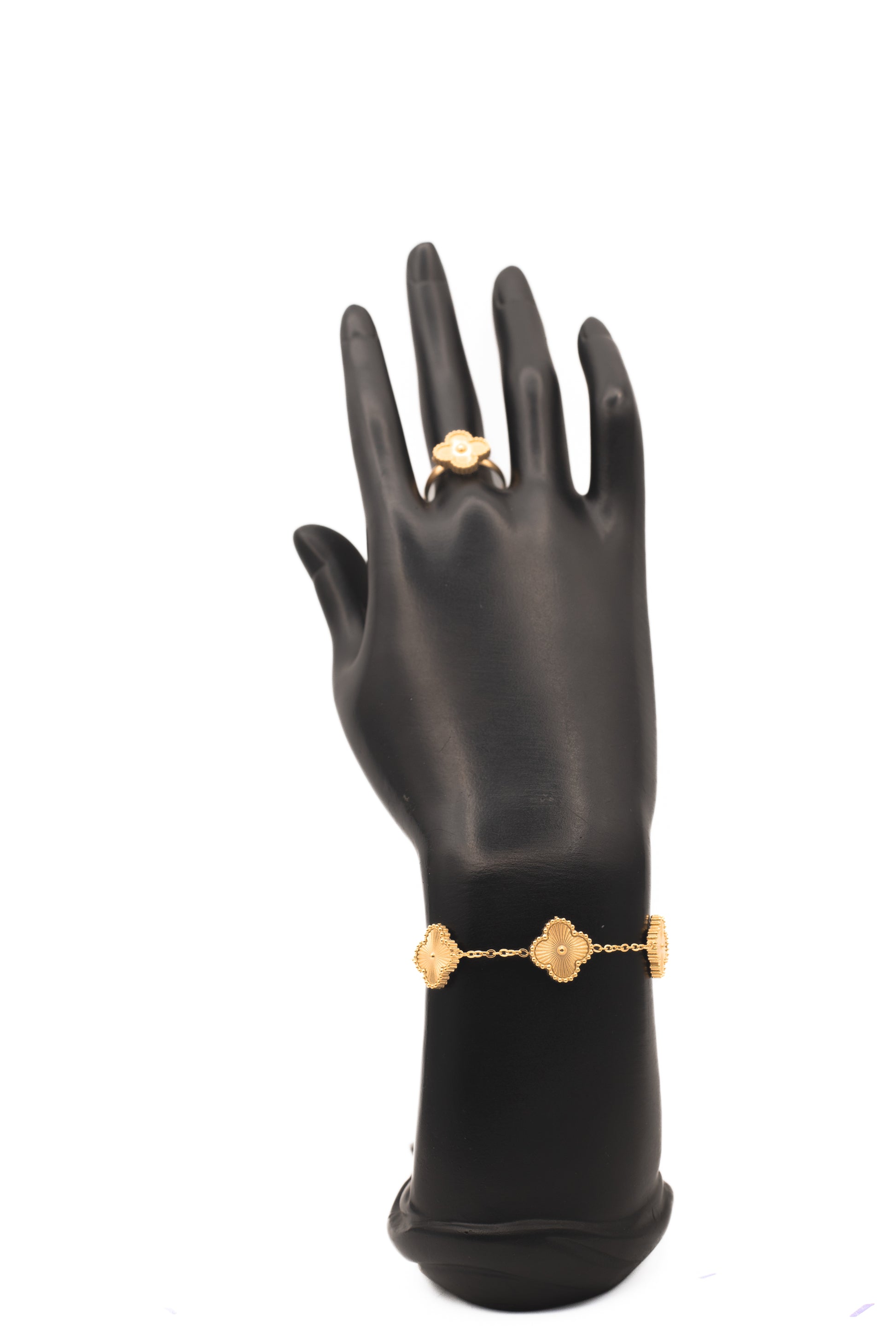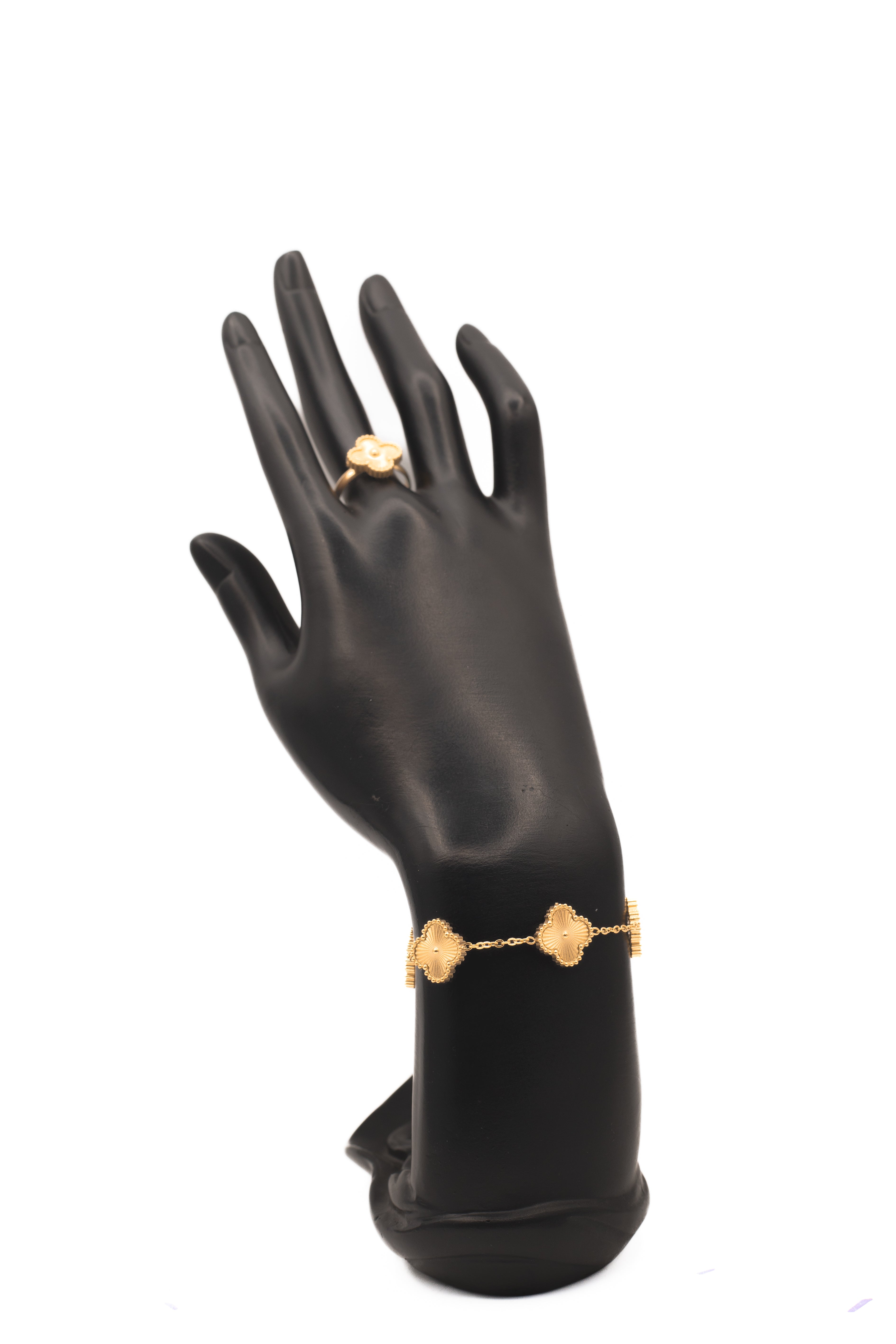 Complete Suite: Build a full look with the matching Station Necklace, 5-Motif Bracelet, Stud Earrings, and Statement Ring.