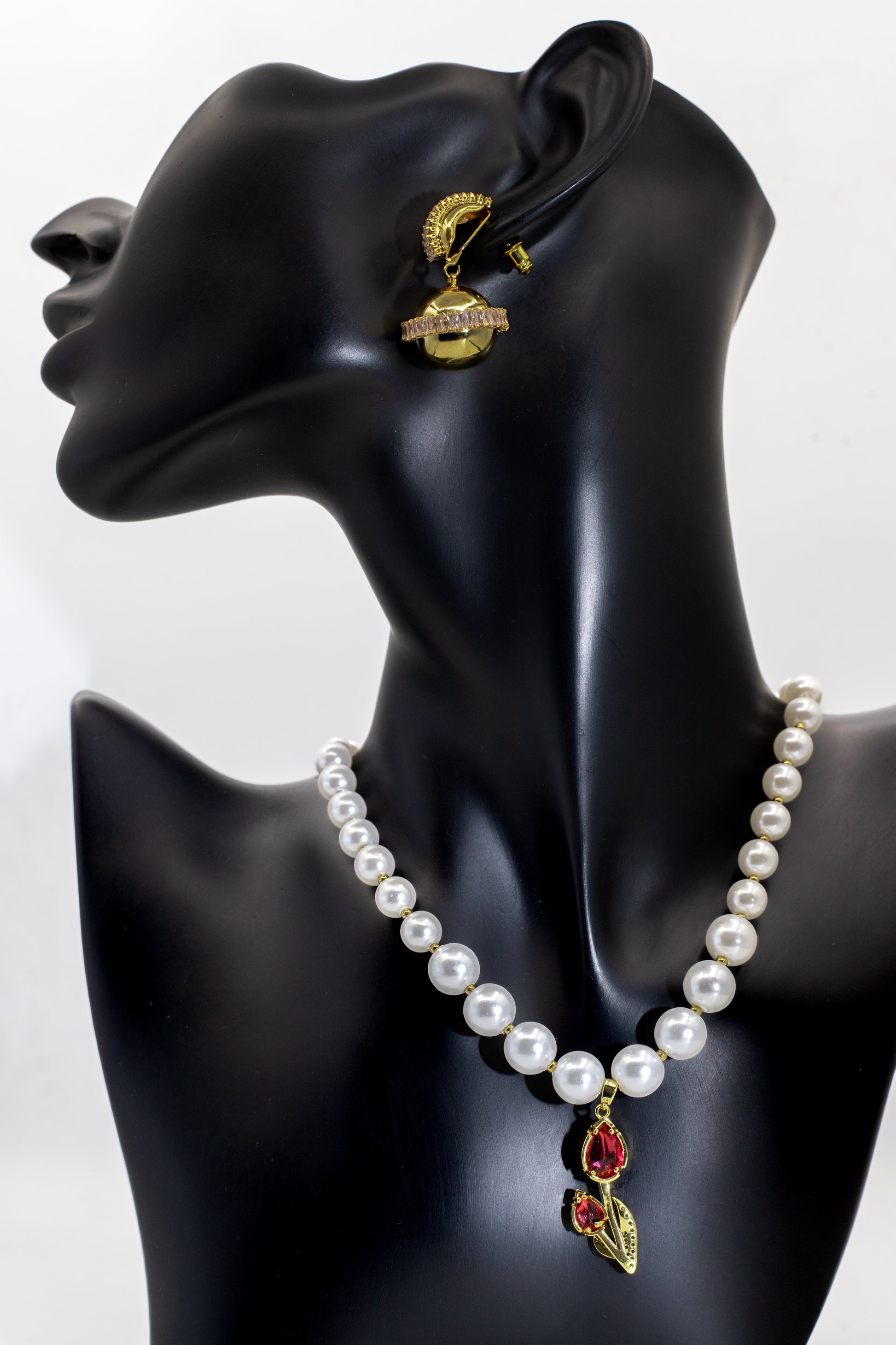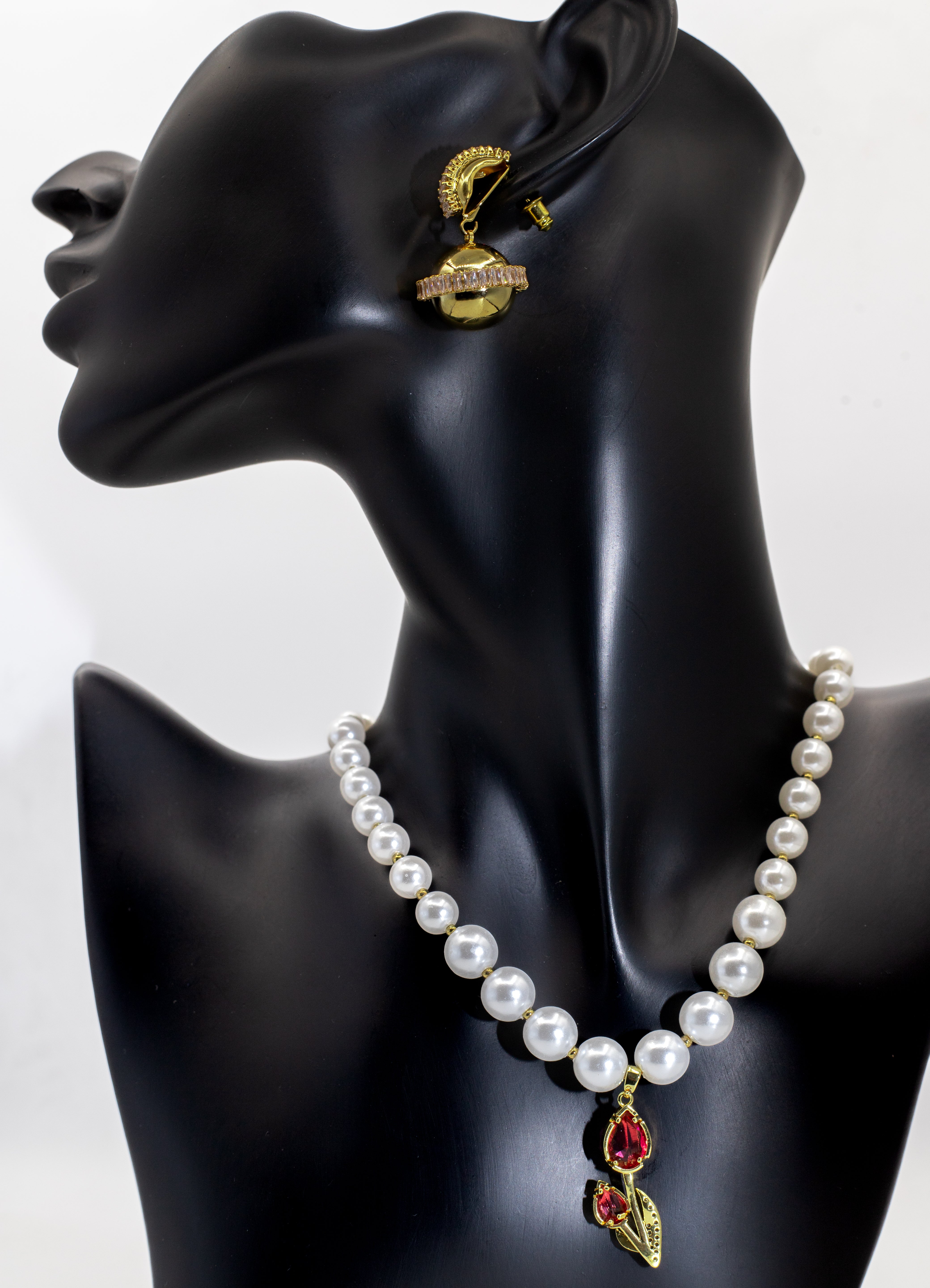 Define opulent tradition and sophisticated glamour with our Luxury Golden Pearl & Ruby Floral Necklace Set. The necklace features a classic strand of lustrous faux pearls paired with a striking golden pendant adorned with a deep ruby red crystal and delicate leafy accents. The set is completed by large, wide crystal-pave hoop earrings, making it an ideal Statement Bridal Set choice for weddings and festive occasions. This set beautifully blends tradition with contemporary sophistication.