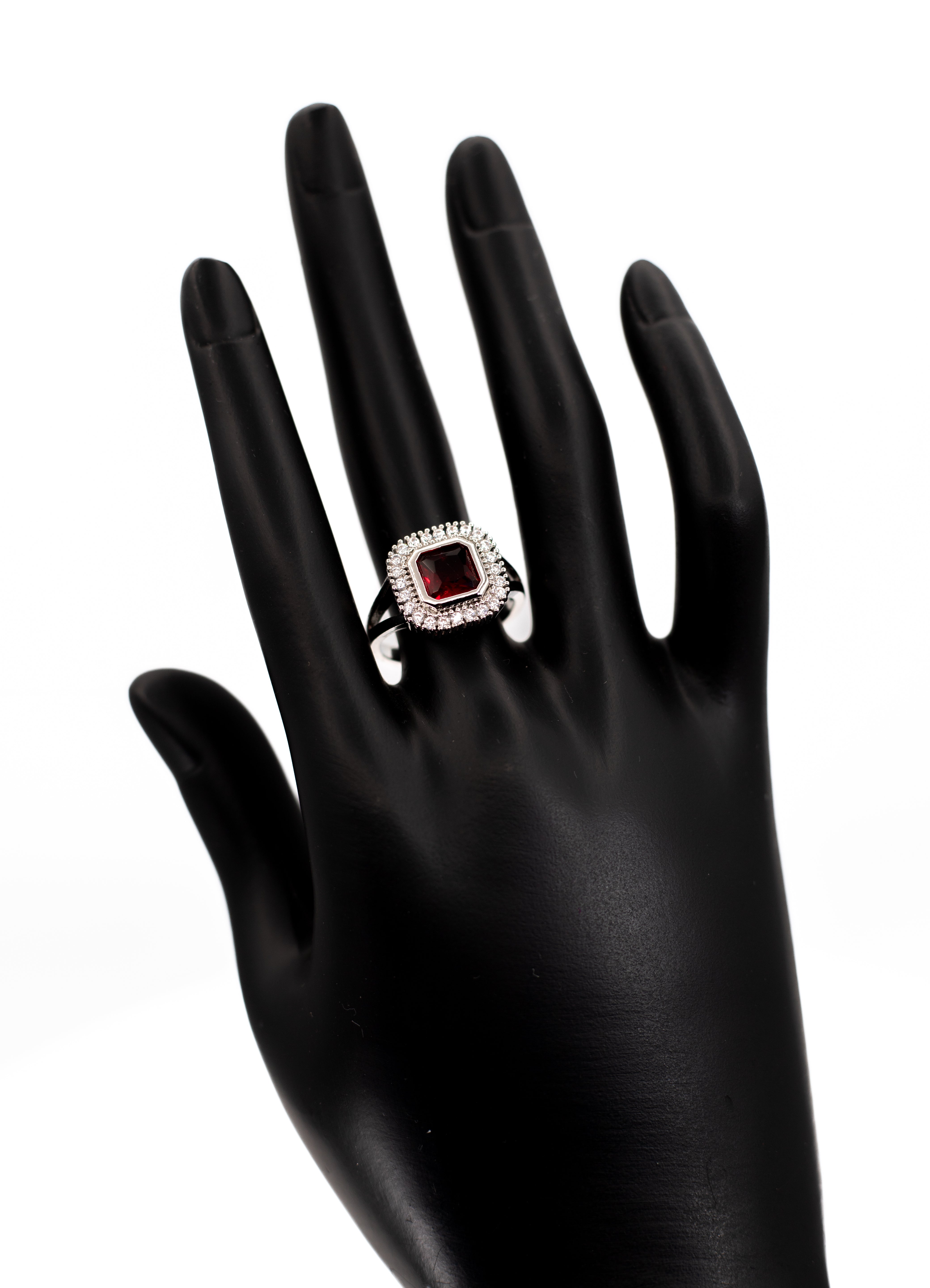 🔥 Passionate Brilliance: This Sterling Silver ring showcases a breathtaking deep Red Garnet octagon-cut center stone. The vibrant central stone is framed by a double halo, creating unparalleled sparkle. A captivating statement piece.