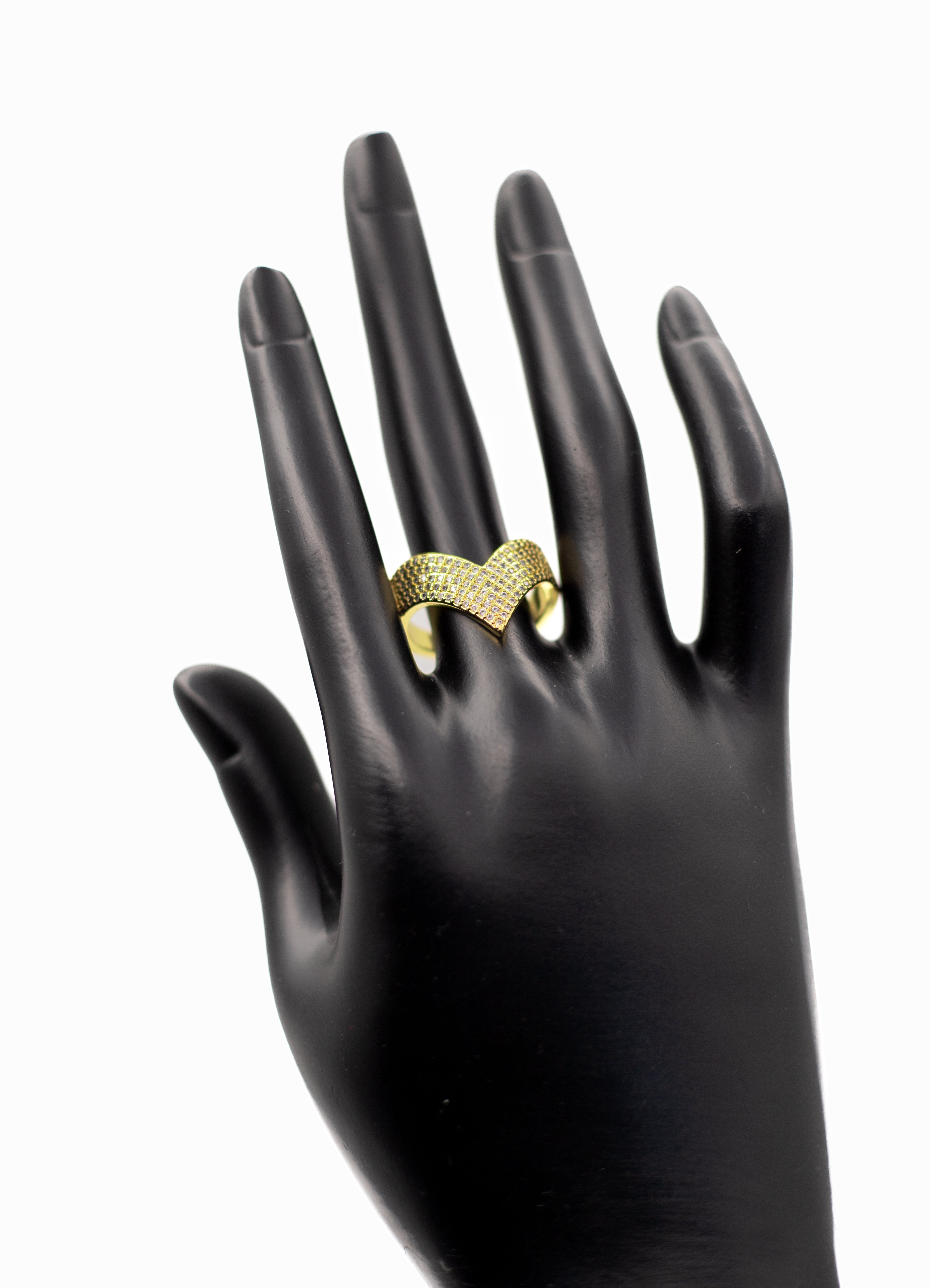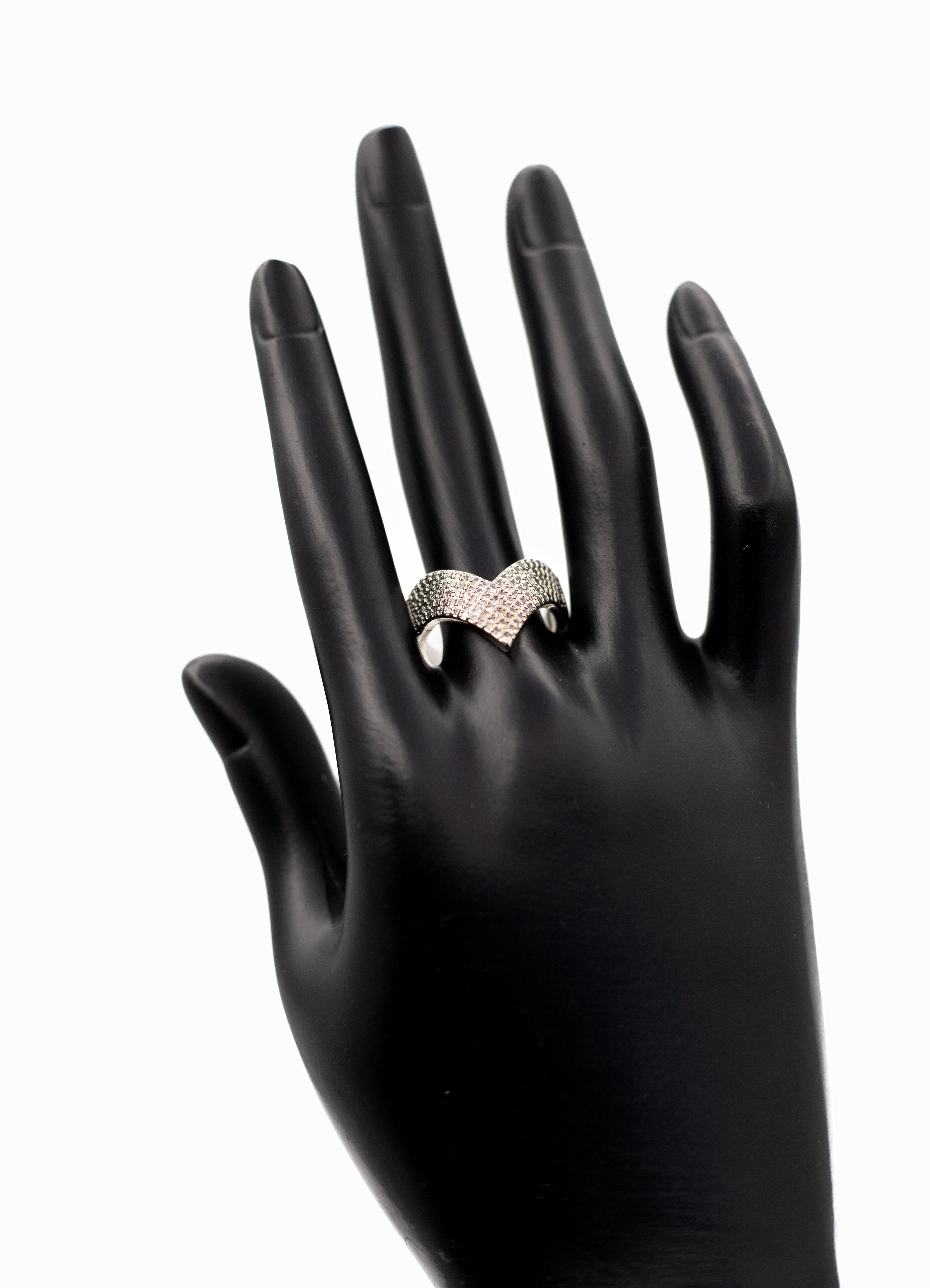 Make a bold, brilliant statement with modern geometric flair. This stunning V-shaped chevron ring is designed for those who love high-impact sparkle. The entire surface of the wide V-silhouette is meticulously encrusted with pavé-set crystals, creating a continuous field of light that catches the eye from every angle.