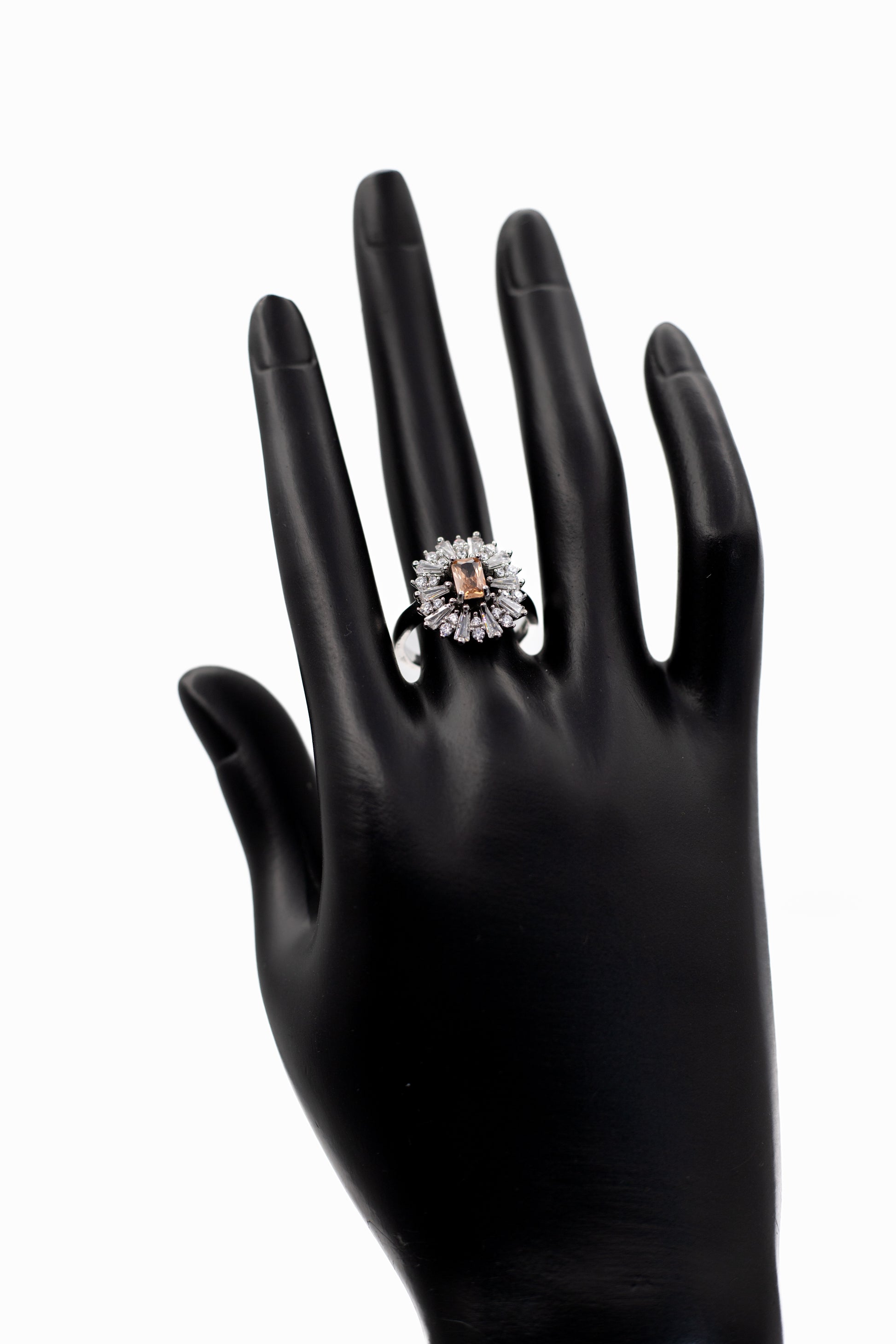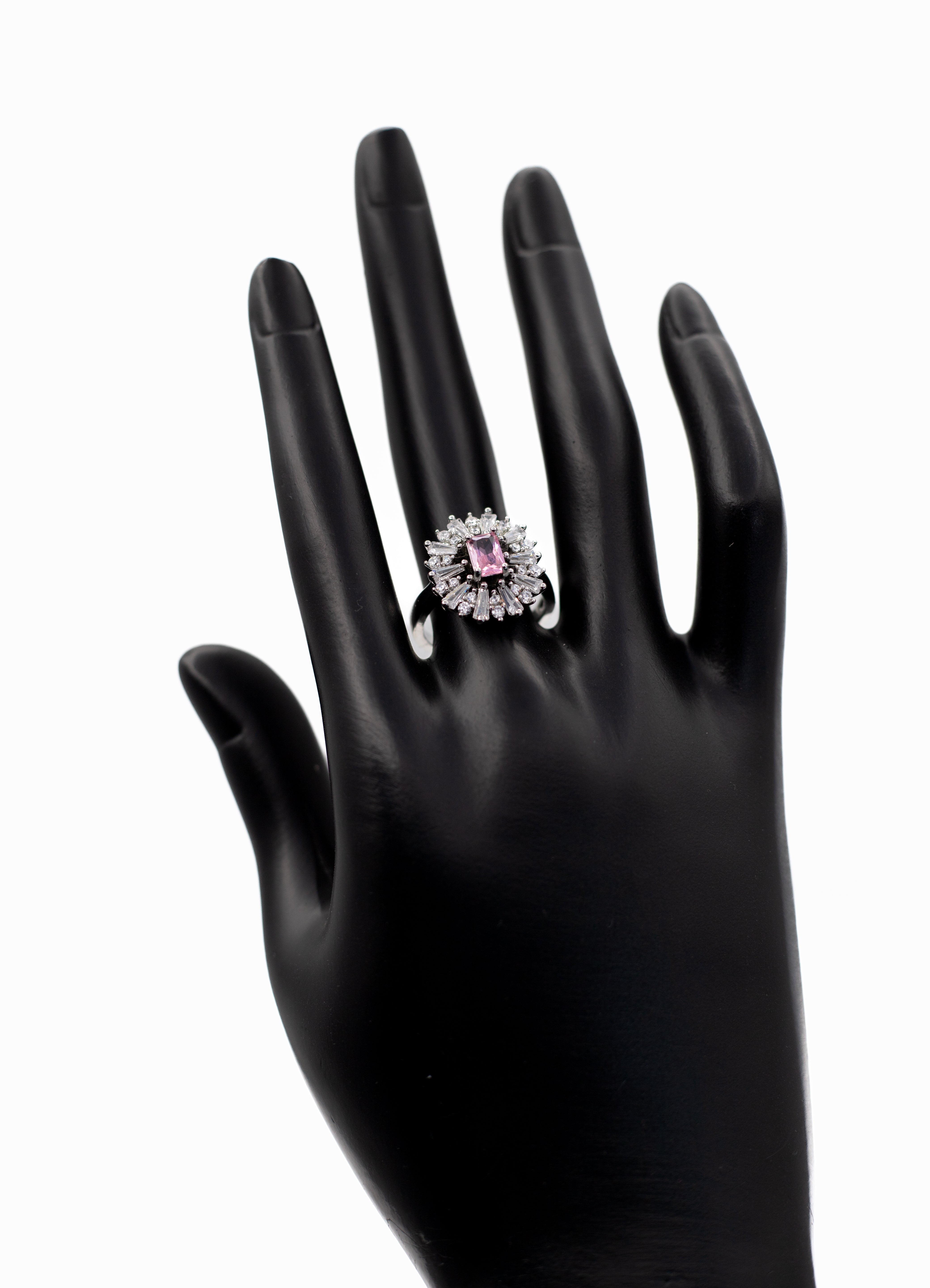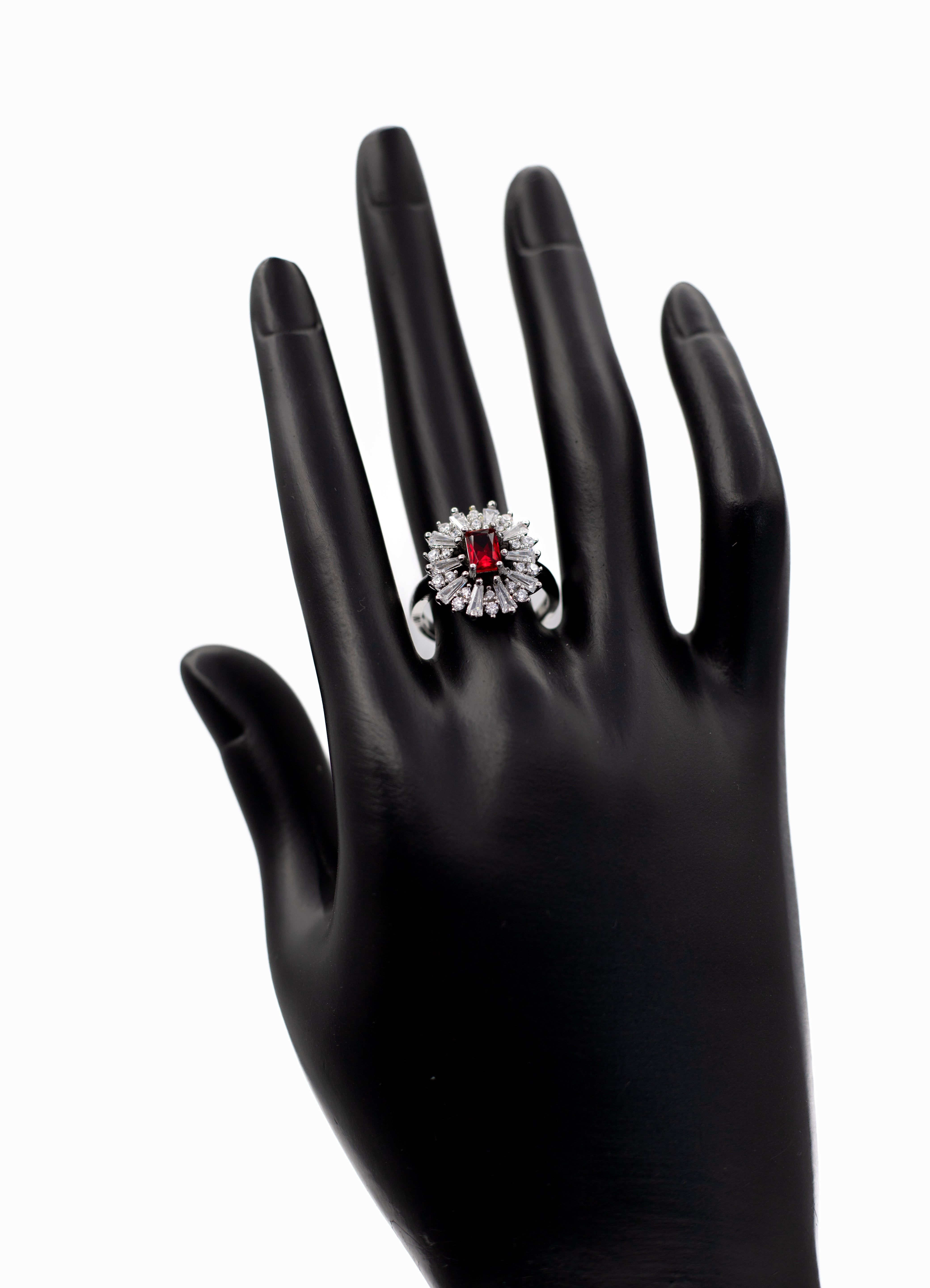 Add a touch of breathtaking glamour to your hand with the Adjustable Silver Emerald-Cut Radiant Crystal Ring. This exquisite statement piece features a striking emerald-cut (rectangular) center stone surrounded by a dramatic halo of tapered baguette and round clear crystals, creating a dazzling sunburst or snowflake effect. The ring is finished with a sophisticated split-shank band, paved with shimmering stones that lead the eye to the centerpiece. Designed for versatility, it features an adjustable open band, allowing you to resize it gently to fit any finger perfectly. Whether you are looking for a cocktail ring for a special event or a sparkling gift where you don't need to know the exact size, this ring offers a luxurious, diamond-like shine. It is available in a stunning array of colors to match your mood or birthstone.