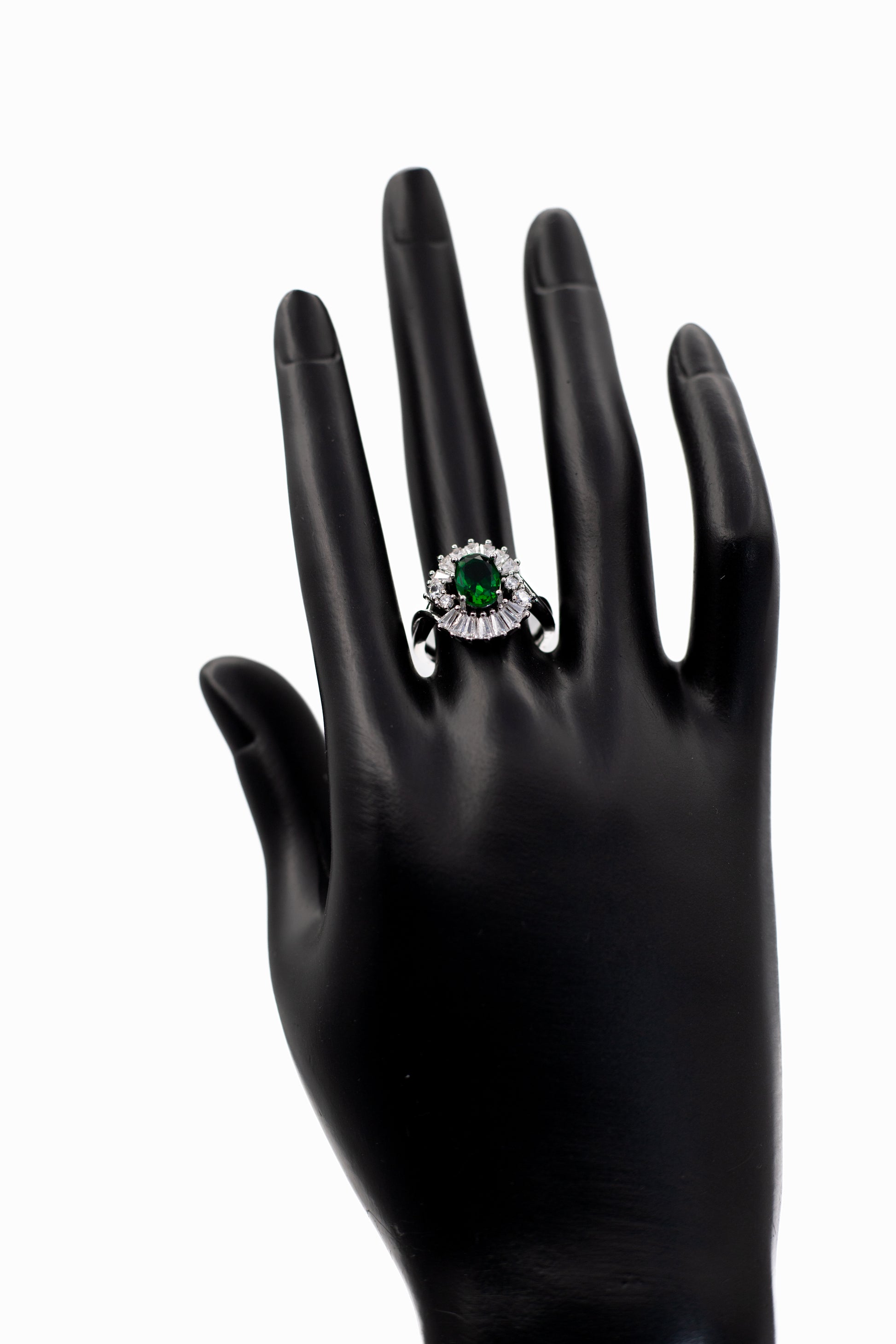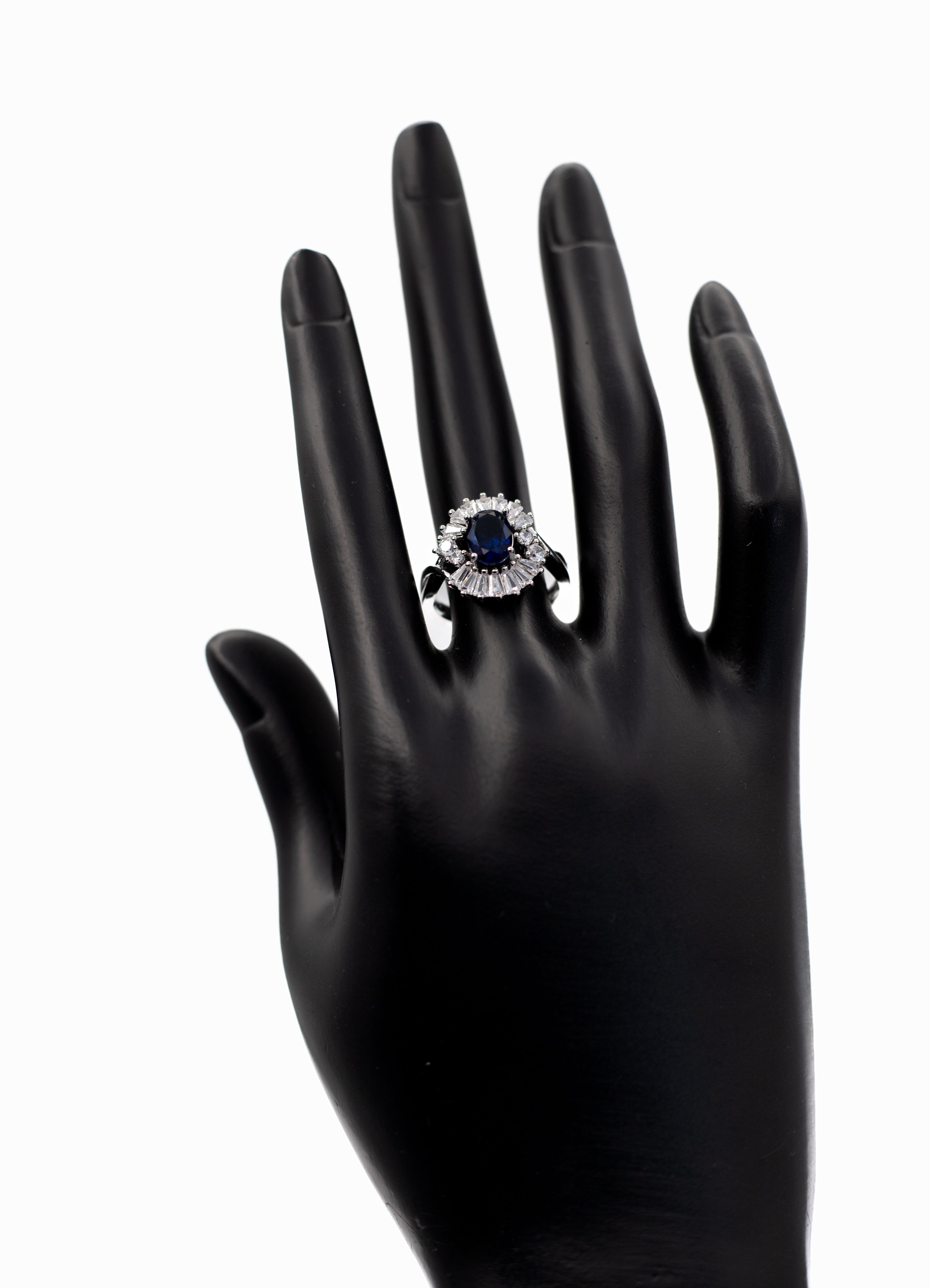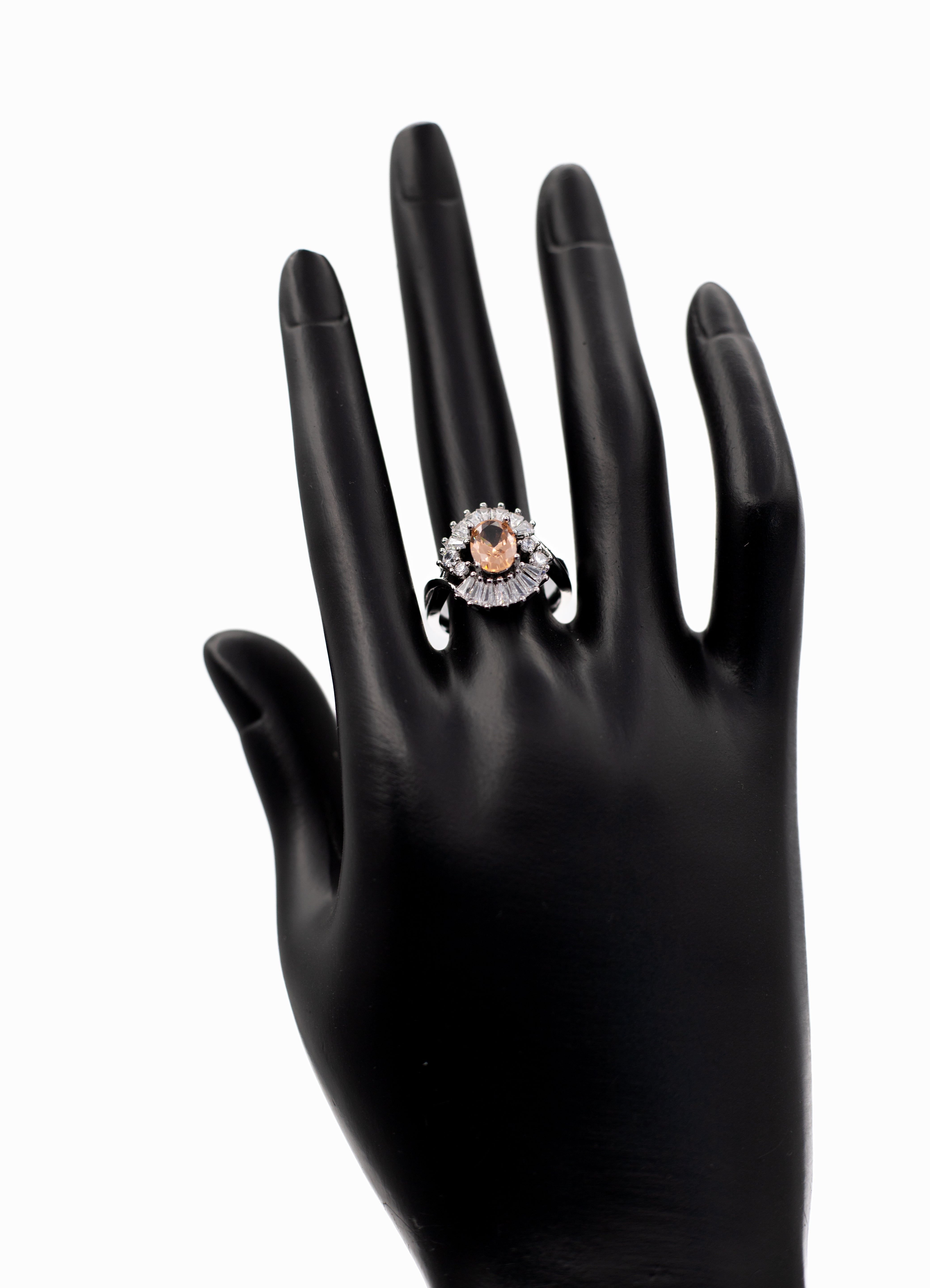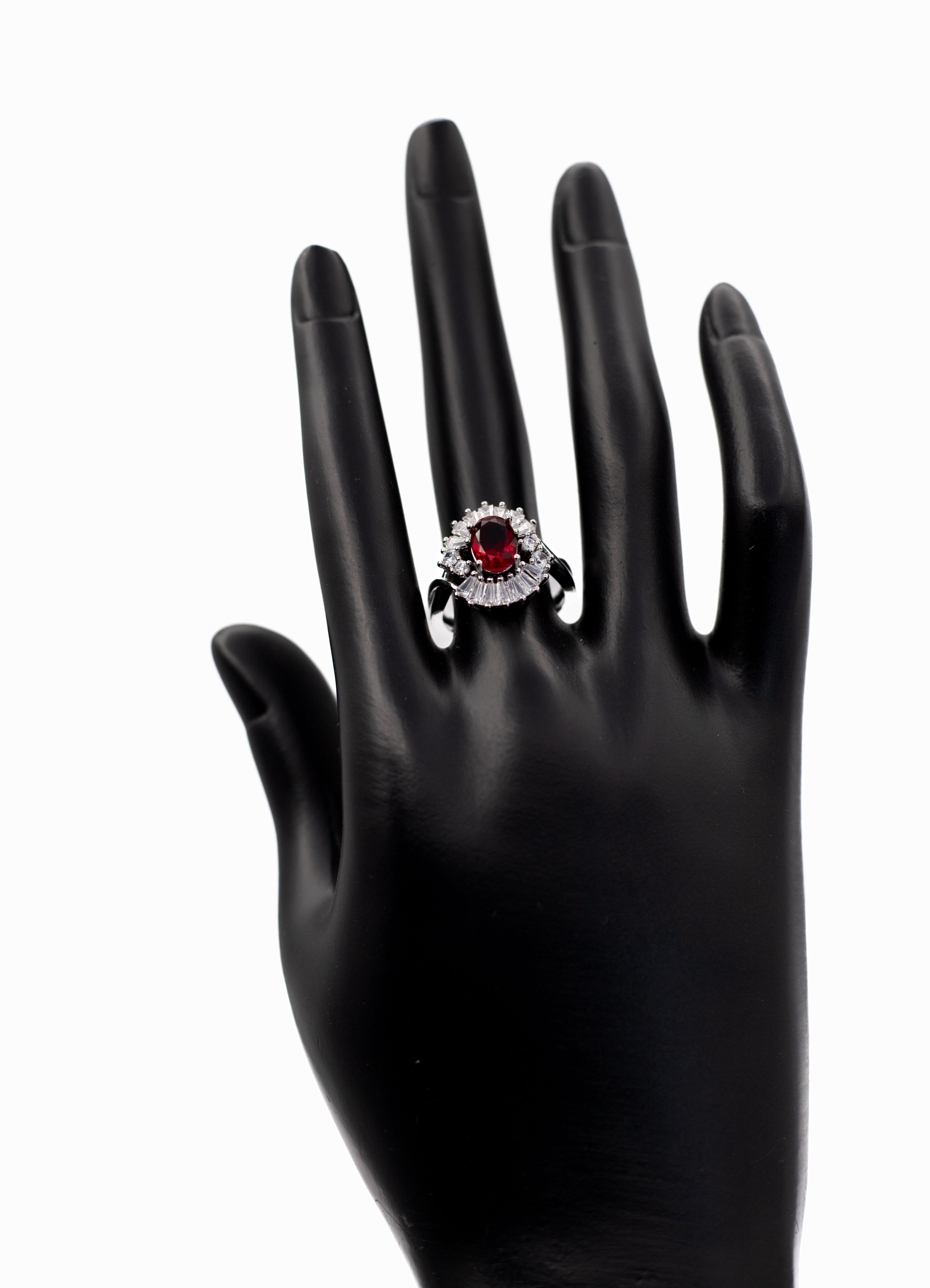 Add a touch of breathtaking glamour to your hand with the Adjustable Silver Oval Radiant Crystal Ring. This exquisite statement piece features a brilliant oval-cut center stone surrounded by a dramatic halo of tapered baguette and round clear crystals, creating a dazzling sunburst effect. The ring is finished with a sophisticated split-shank band, paved with shimmering stones that lead the eye to the centerpiece. Designed for versatility, it features an adjustable open band, allowing you to resize it gently to fit any finger perfectly. Whether you are looking for a cocktail ring for a special event or a sparkling gift where you don't need to know the exact size, this ring offers a luxurious, diamond-like shine. It is available in a stunning array of colors to match your mood or birthstone.