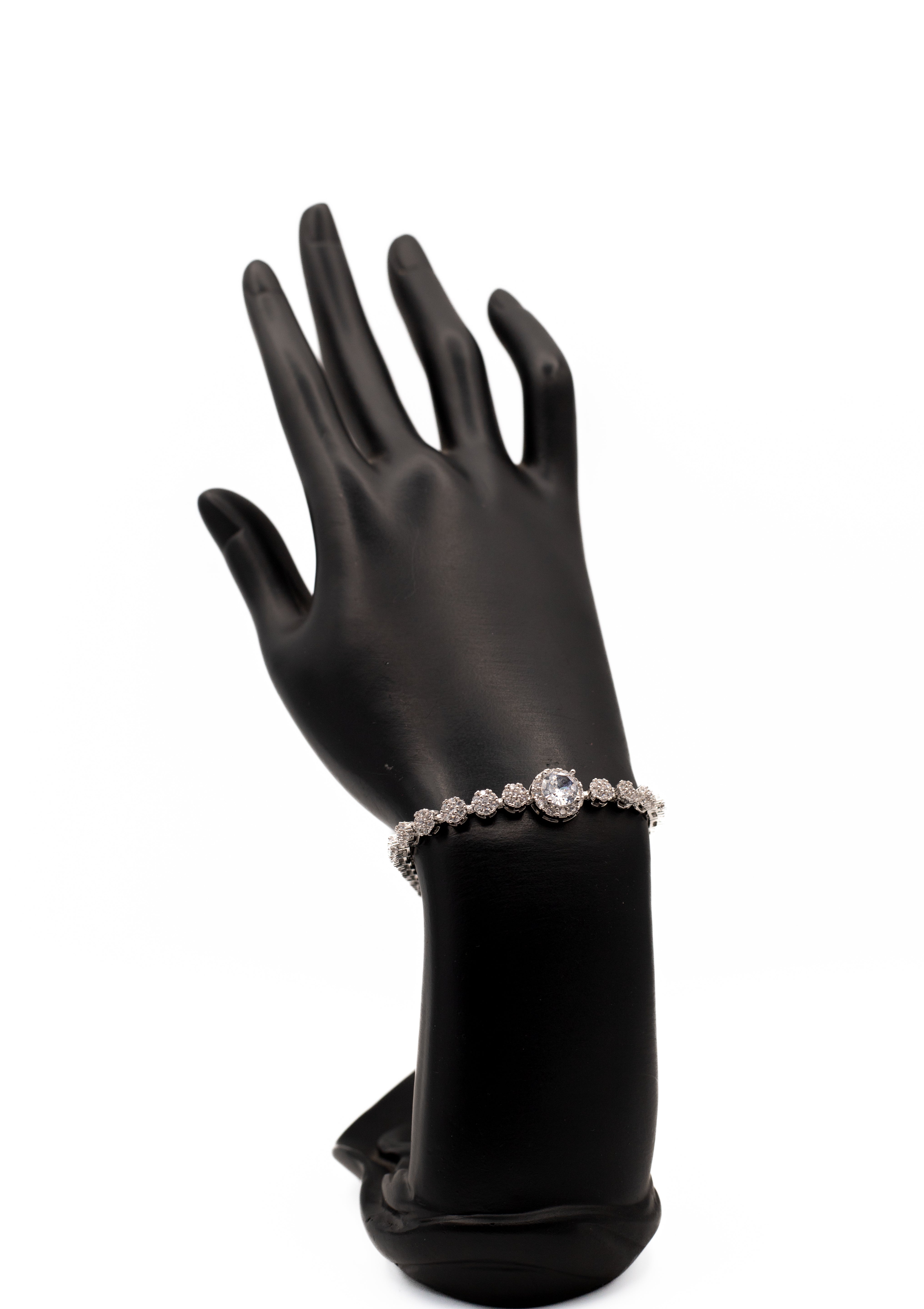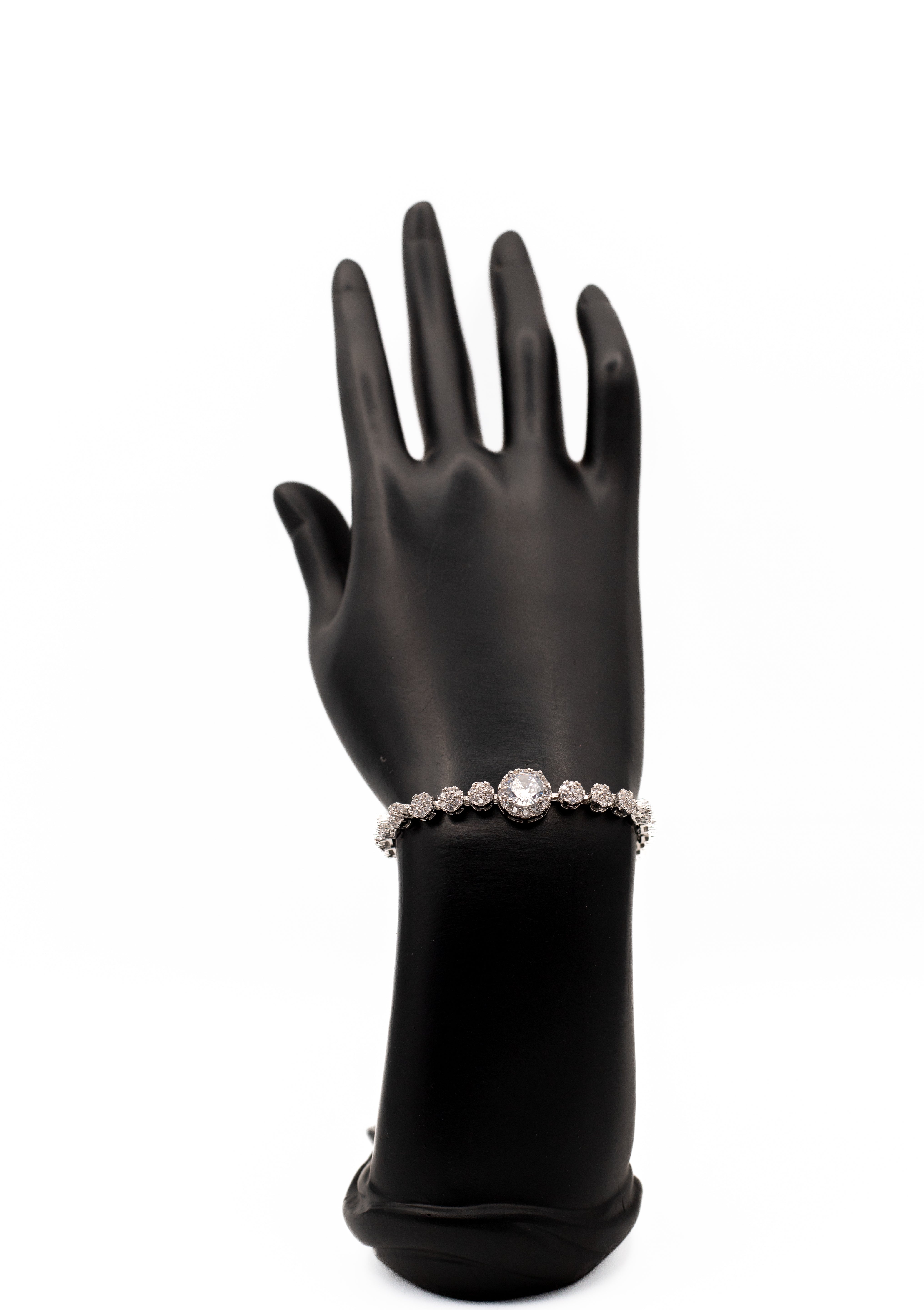 Make a statement with our sparkling silver-toned bracelet. It showcases a magnificent, large round solitaire cubic zirconia centerpiece, perfectly framed by delicate pave crystal links. Ideal as a bridal bracelet, for formal events, or as a dazzling anniversary gift. This piece offers diamond-like brilliance and high-quality construction. Affordable statement jewelry for your next event.